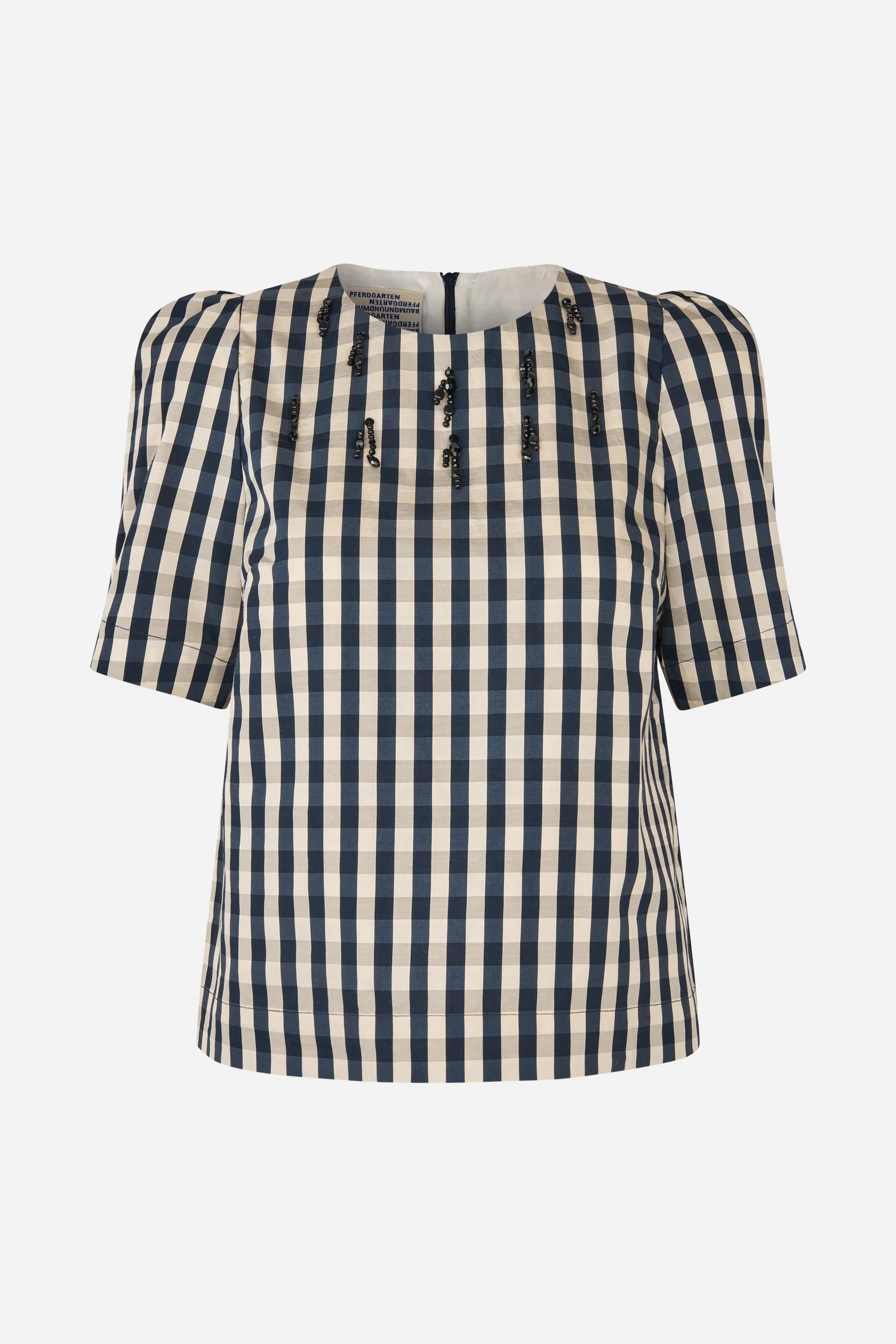 De Minu-blouse is een levendig kledingstuk dat klassieke ruitjes combineert met sierlijke kwastjes op de borst. De blouse heeft een comfortabele pasvorm en pofmouwen en voegt elegantie toe aan je garderobe.