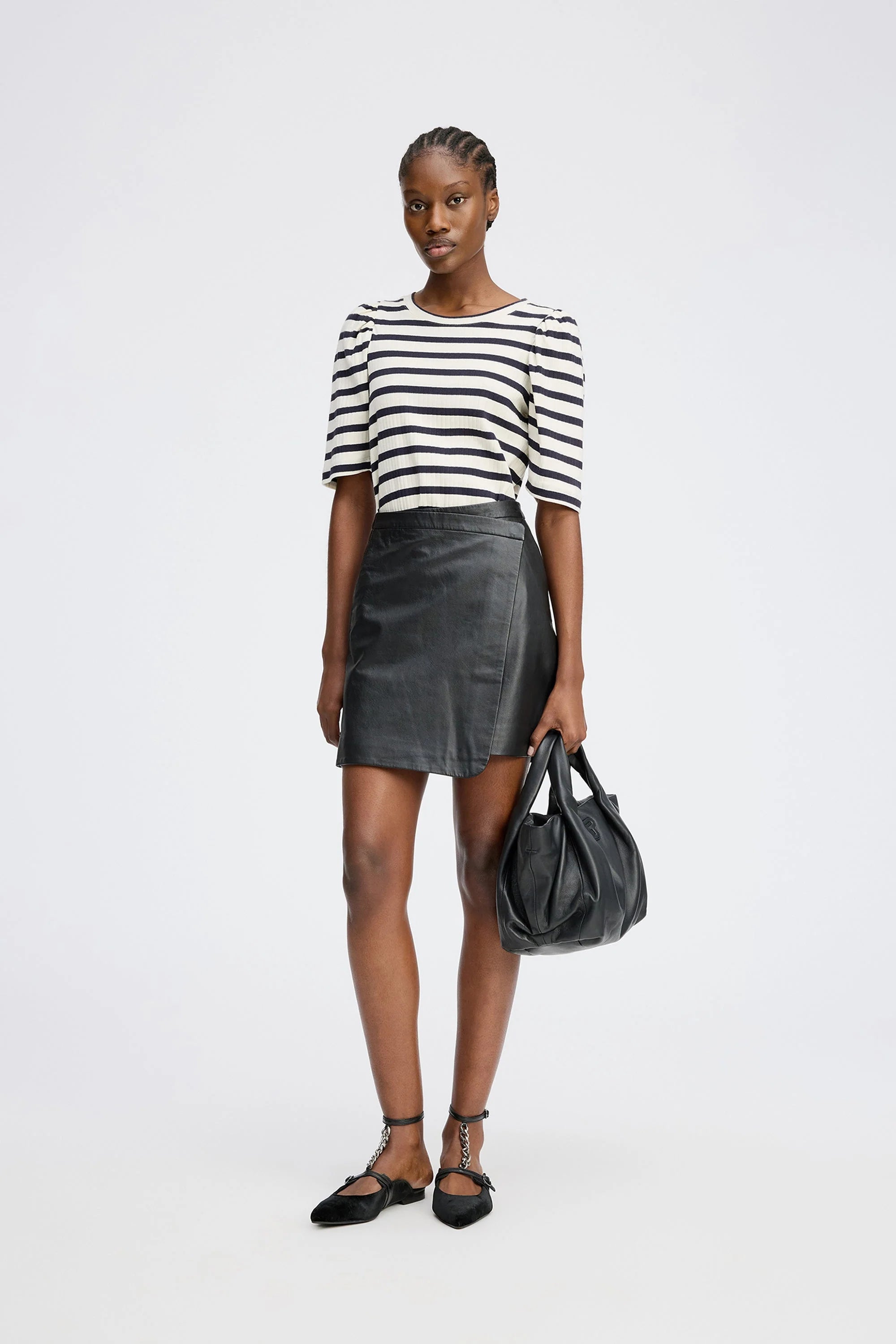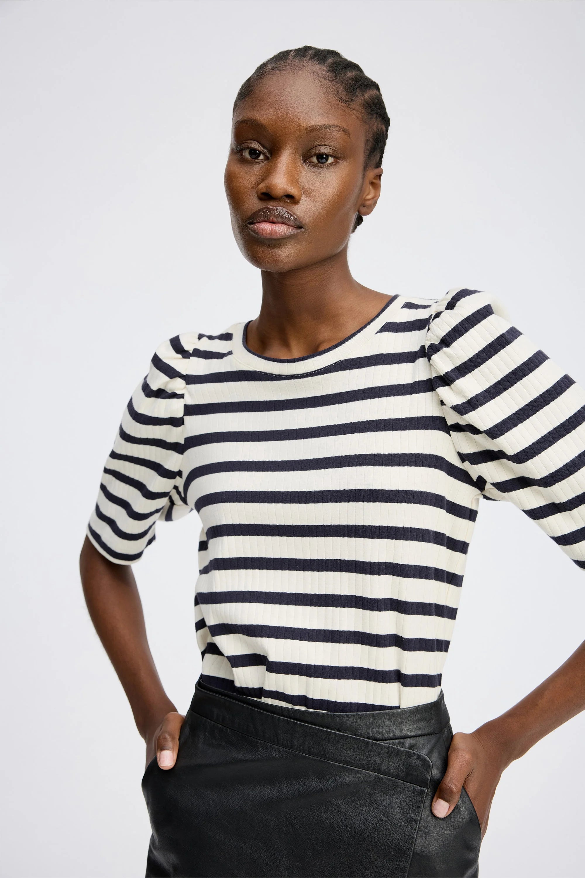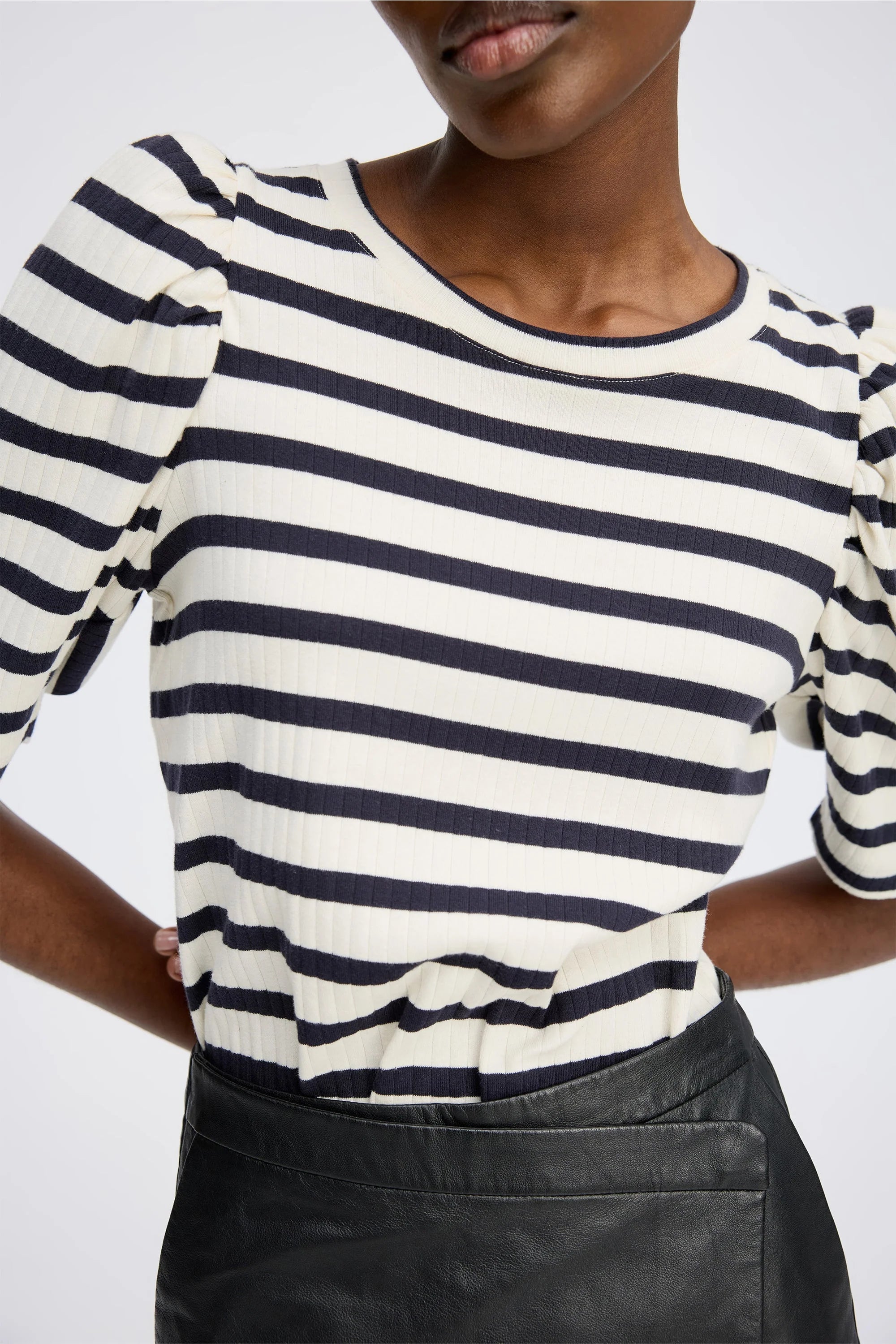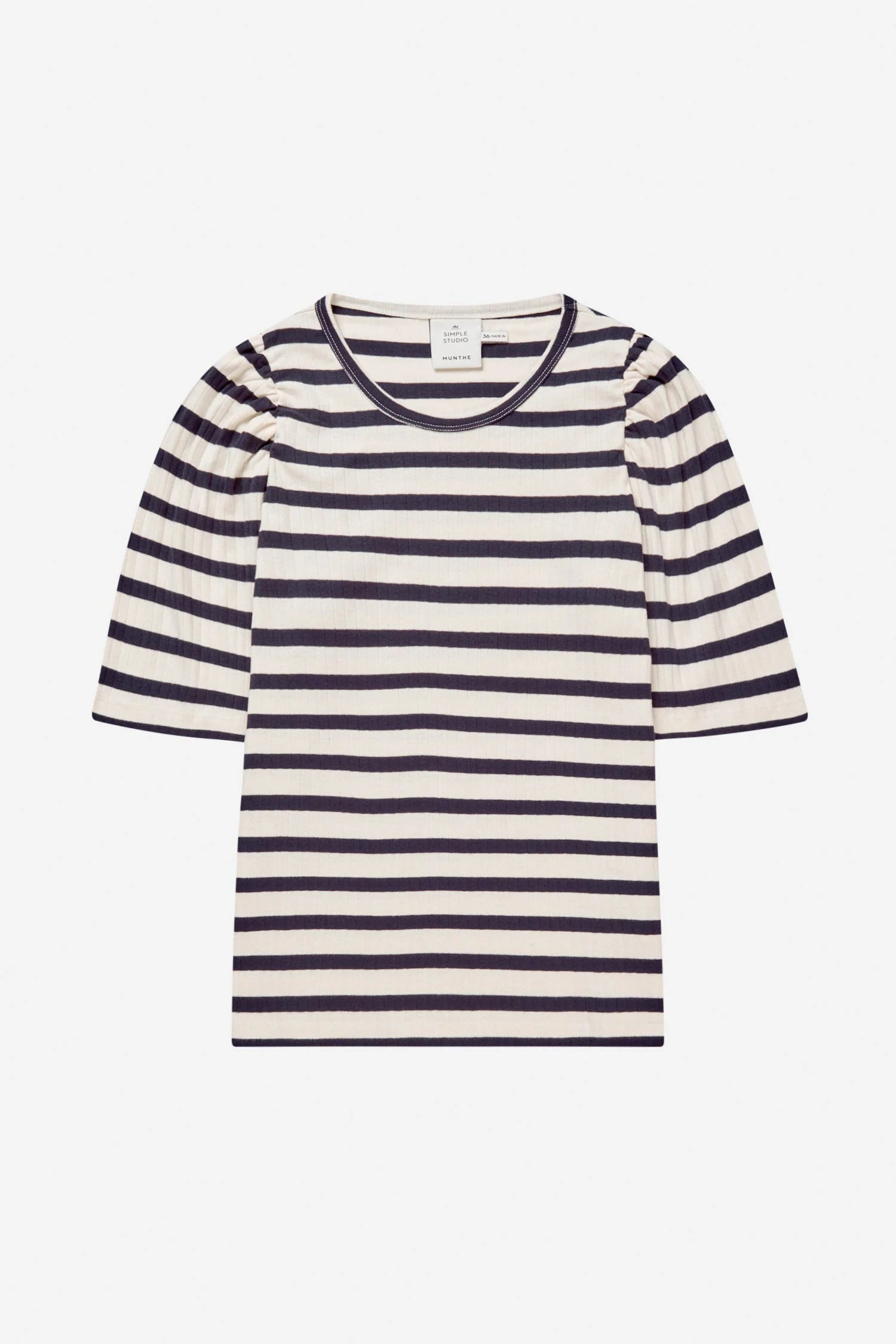 Jikolaz Shirt in de kleur Navy van het Deense merk Munthe. Gestreept t-shirt met lichte, elegante pofmouwen. Het t-shirt is gemaakt van 100% biologische katoen en heeft een ronde hals en een lage schoudernaad.