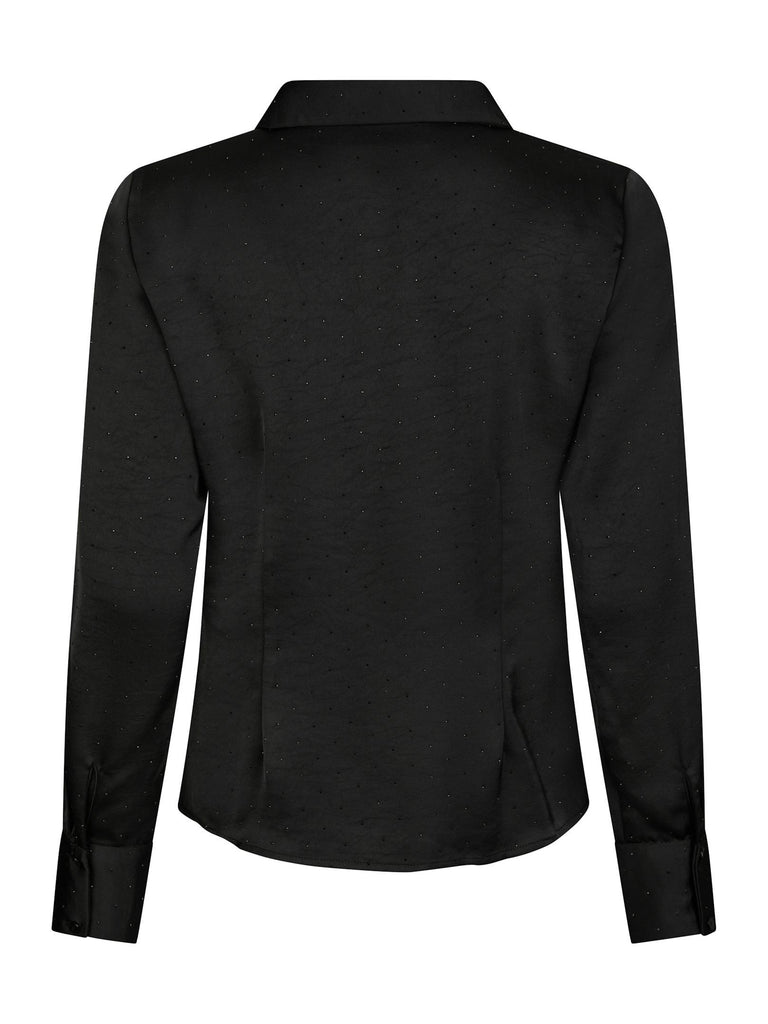Christy Heavy Sateen Bredaz Shirt in de kleur Black van het Deense merk Neo Noir. Schattige blouse met lange mouwen, smockdetail aan de voorkant, en een v-hals aan de voorkant. De blouse bevat allemaal mooie strass steentjes. Het model is 176 cm lang en draagt maat 36. Combineer met de Emmett Heavy Sateen Bedaz Pants voor een mooie subtiele glitter set!