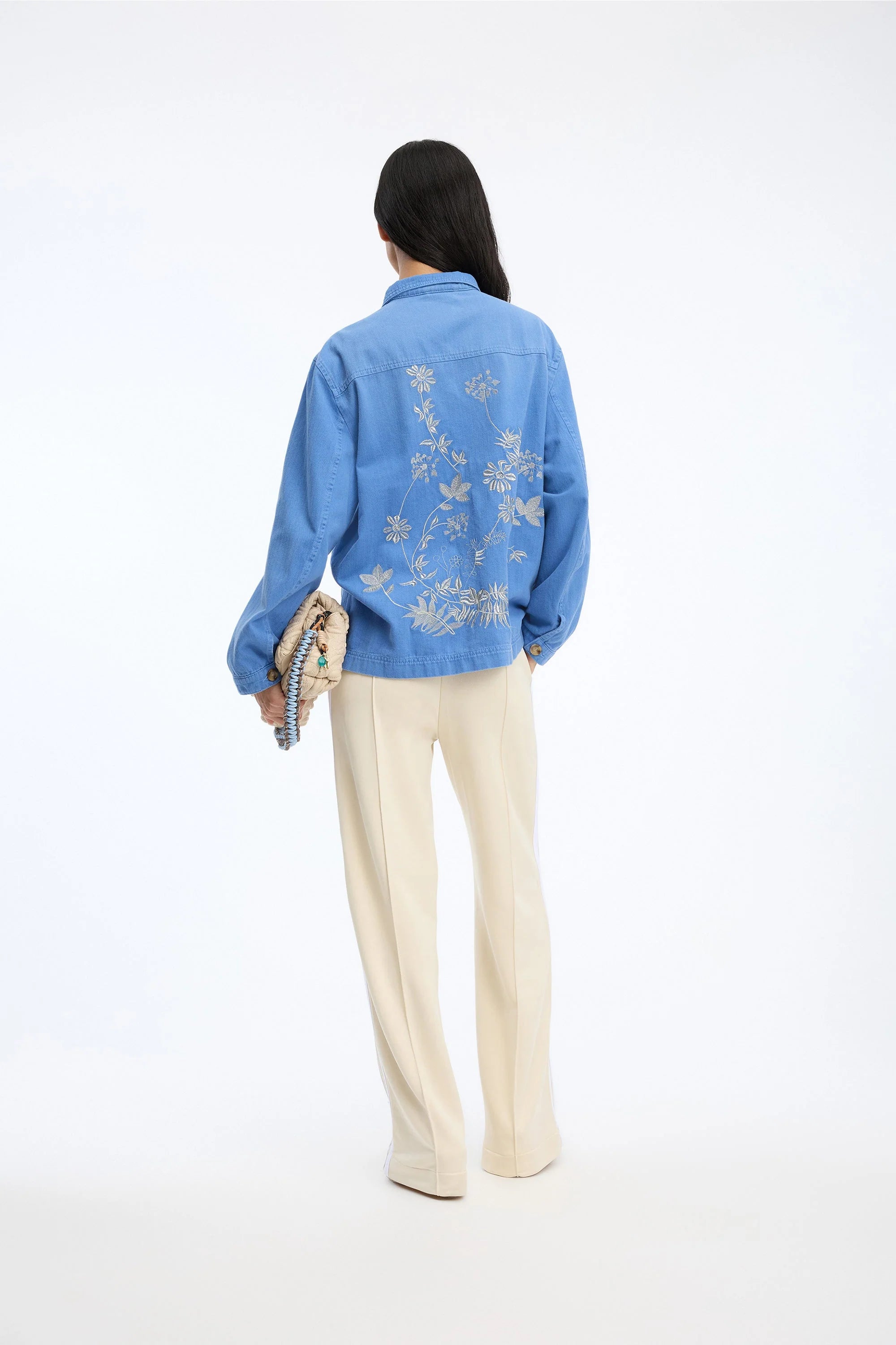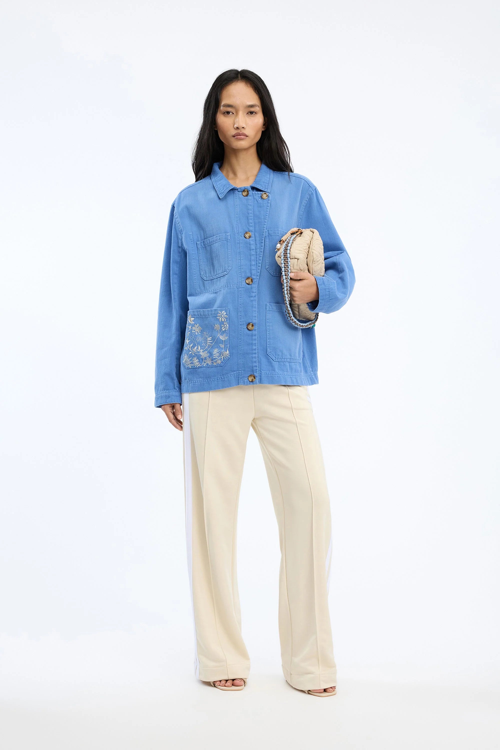 Bayan Jacket in de kleur 'Light Blue' van het Deense merk Munthe. Dit jasje is gemaakt van een zachte geweven stof en heeft vier voorzakken en een knoopsluiting. Het is afgewerkt met een opvallend geborduurd motief op de zak en een grotere, vloeiende bloemenborduring op de achterkant, wat een artistiek en verfijnd accent toevoegt.