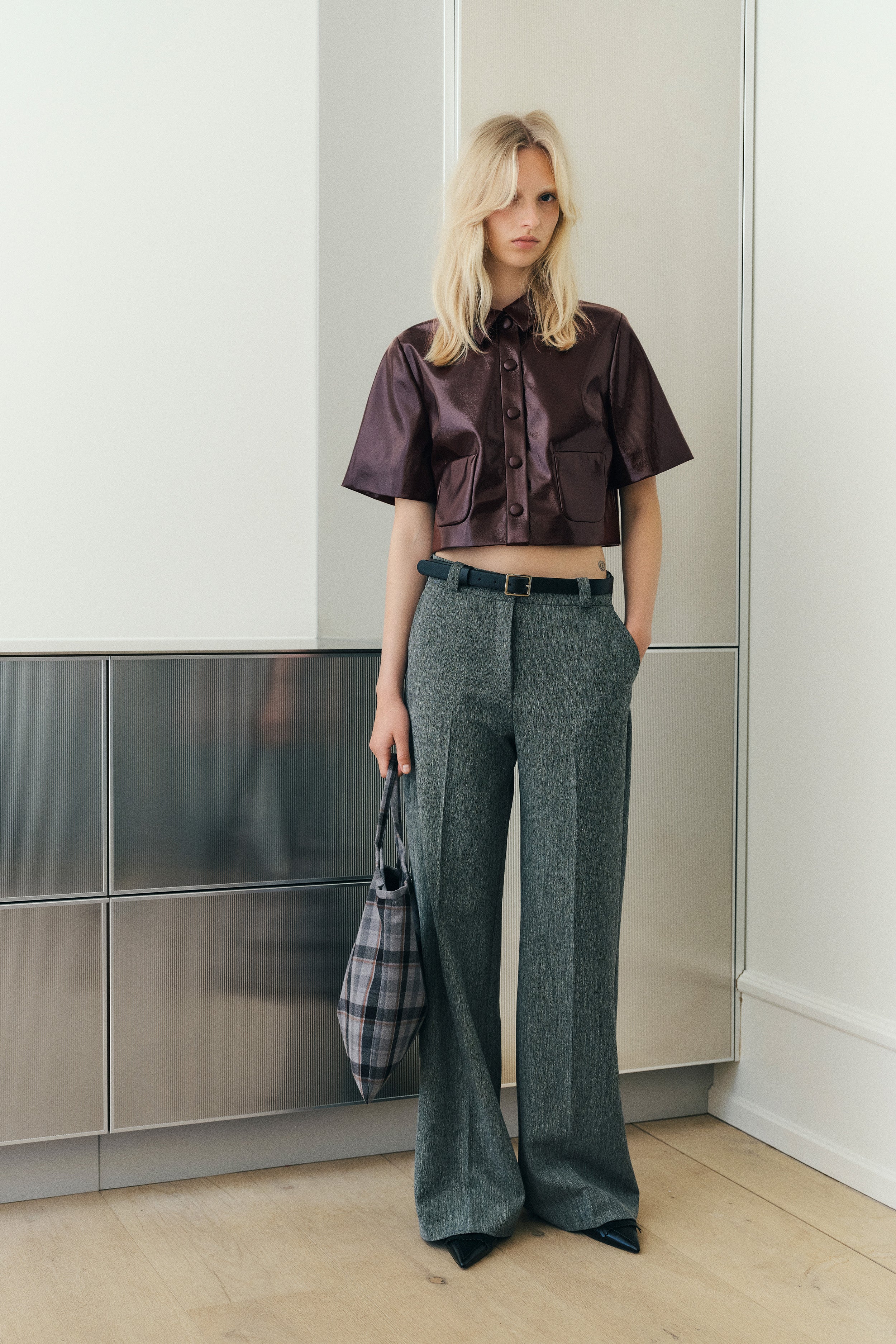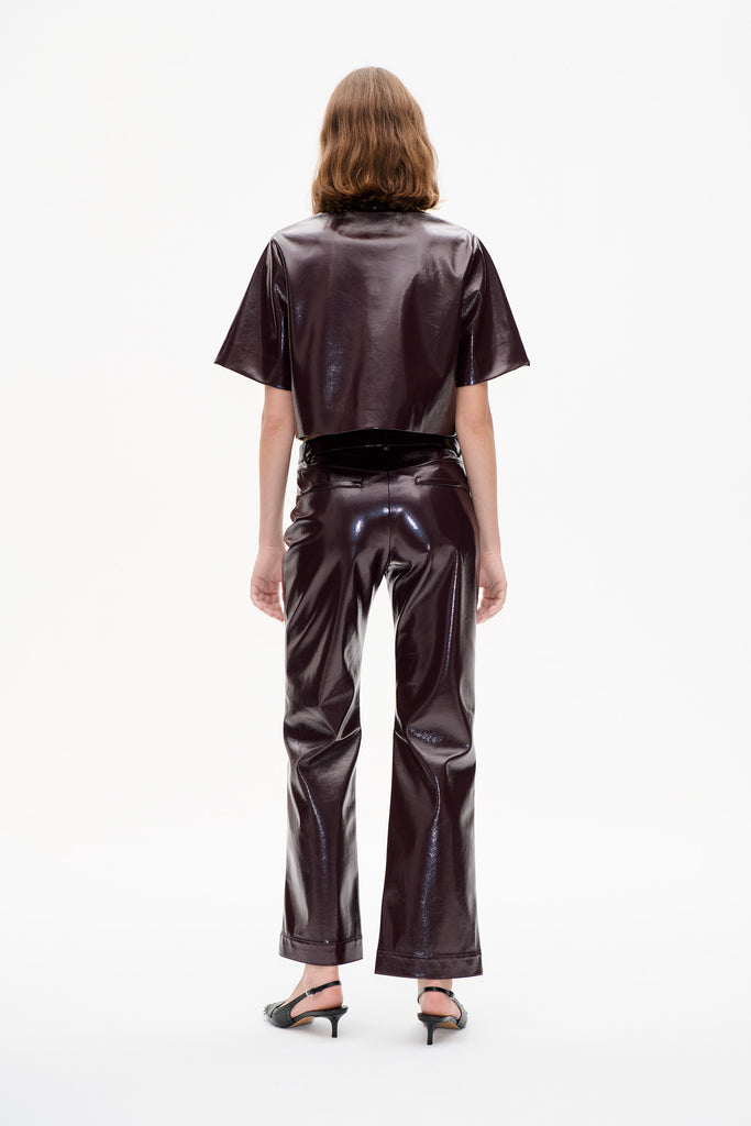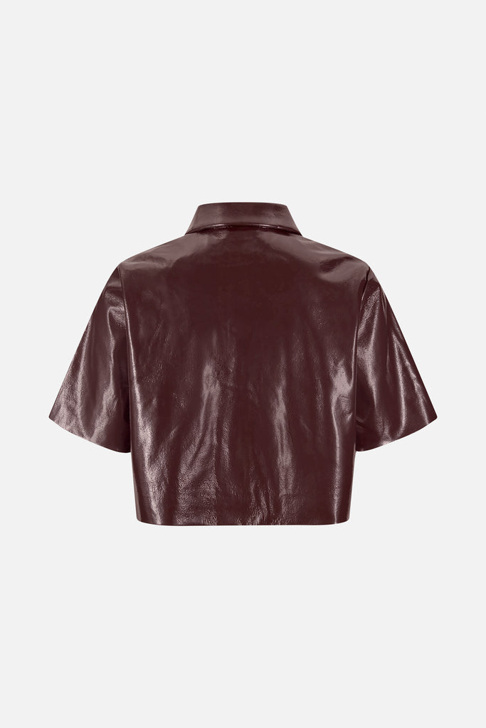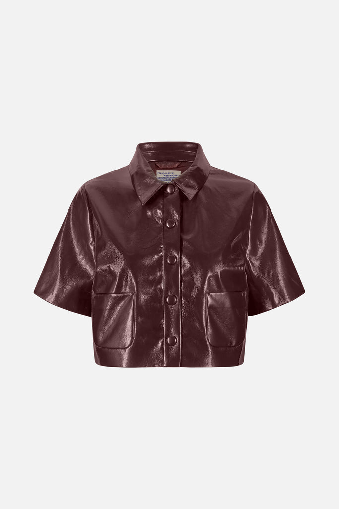 Beth Jacket in de kleur 'Dark Burgundy' van het Deense merk Baum und Pferdgarten. Super gaaf vegan lakleren jasje. Het jasje heeft een boxy fit en valt iets korter. Je kan hem ook dicht dragen als een blouse.