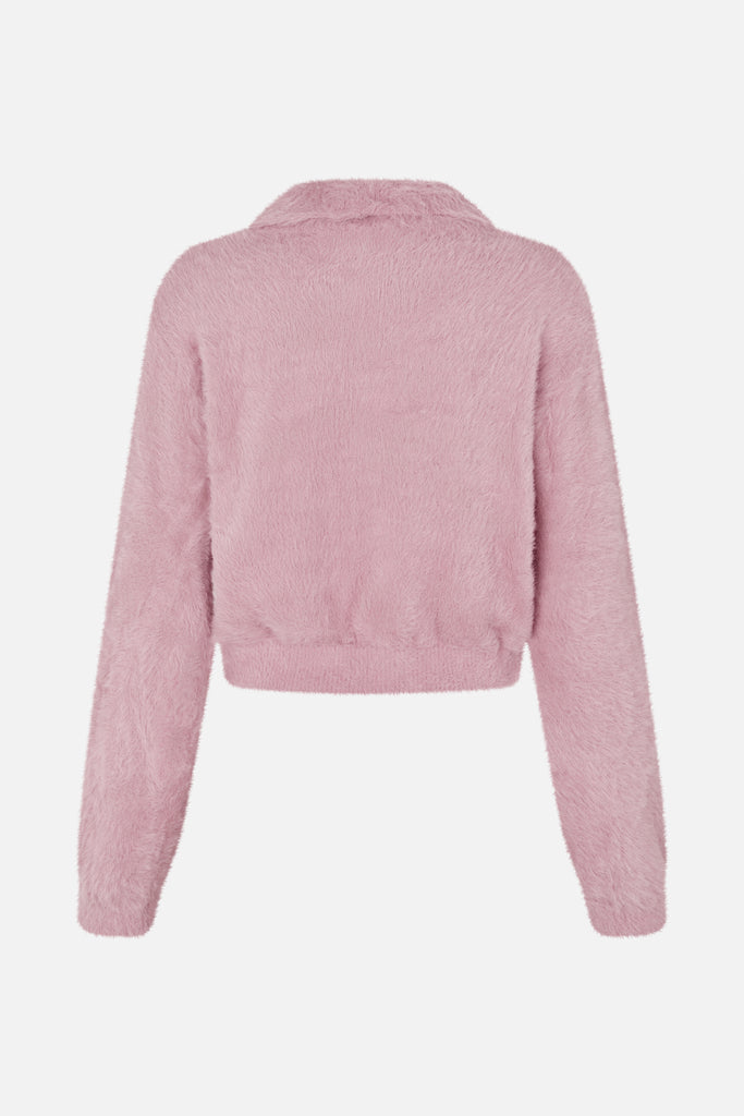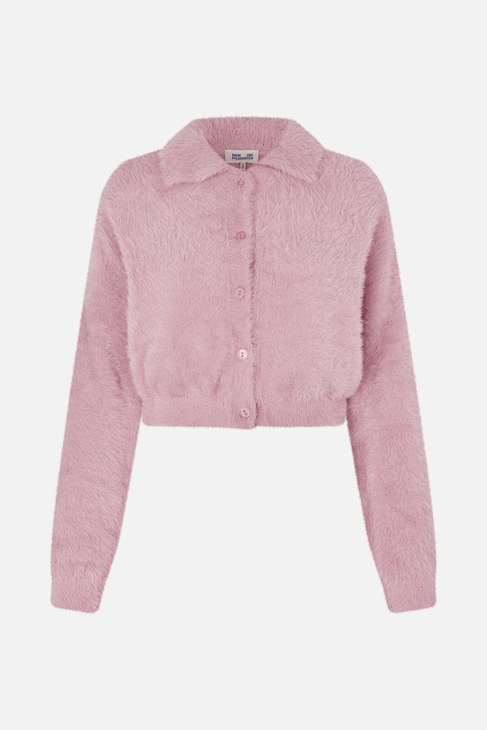 Conni Knit in de kleur 'Dawn Pink' van het Deense merk Baum und Pferdgarten. Een mooi boxy fluffy vest met een knoopsluiting en kraagje. Het vestje valt iets korter. Heel leuk om met een high-waisted jeans te combineren.