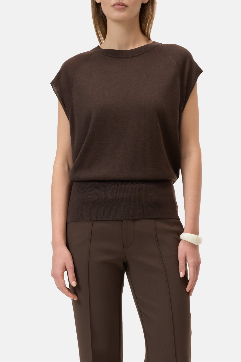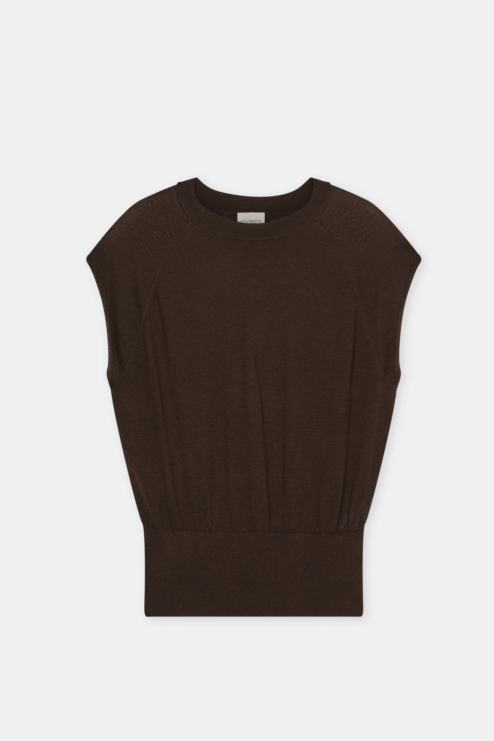 Crew Neck Sleeveless in de kleur 'Maple Brown' van het merk Closed. Deze gebreide top van een zijde-kasjmier mix heeft een normale pasvorm. De mouwloze trui met ronde halslijn zorgt voor een modern silhouet. De hoge ribboord met elastaan garandeert optimaal comfort.