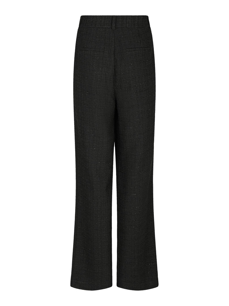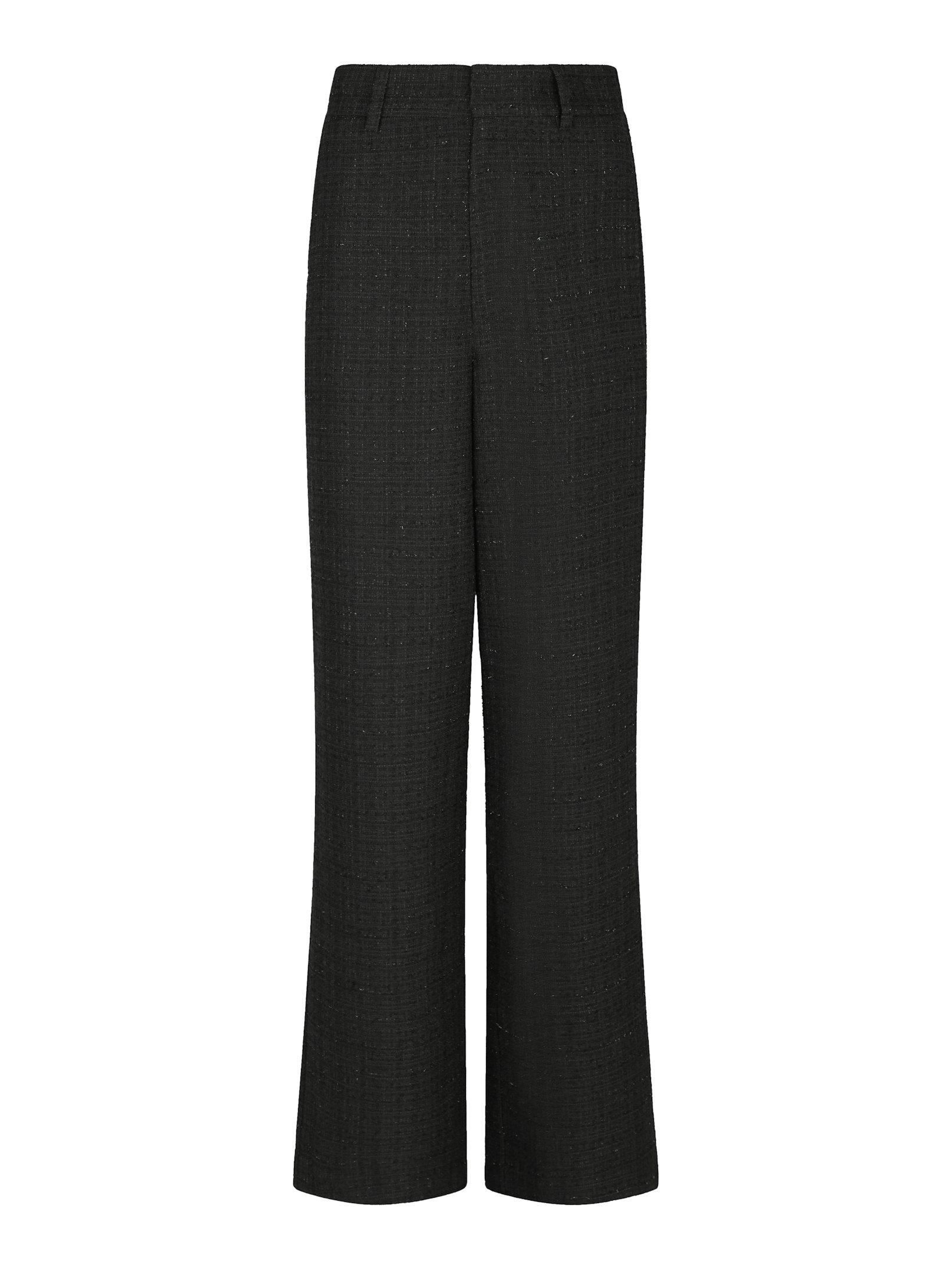Emmett Boucle Pants in de kleur Black van het Deense merk Neo Noir. Broek met wijde pijpen en hoge taille. Gemaakt van een mooie bouclékwaliteit met een subtiele glitter erin verwerkt. Het model is 1,76 m lang en draagt maat 36.