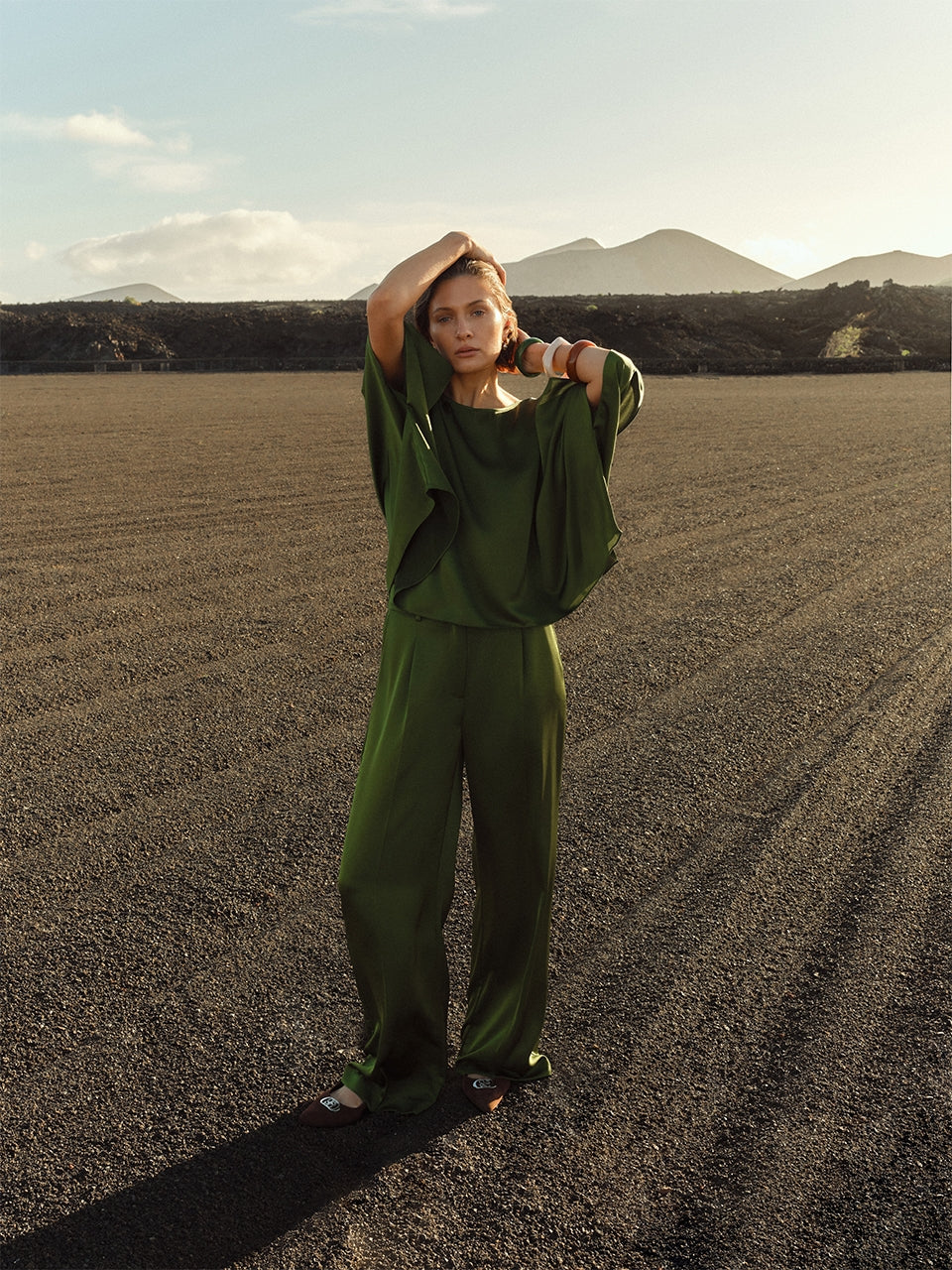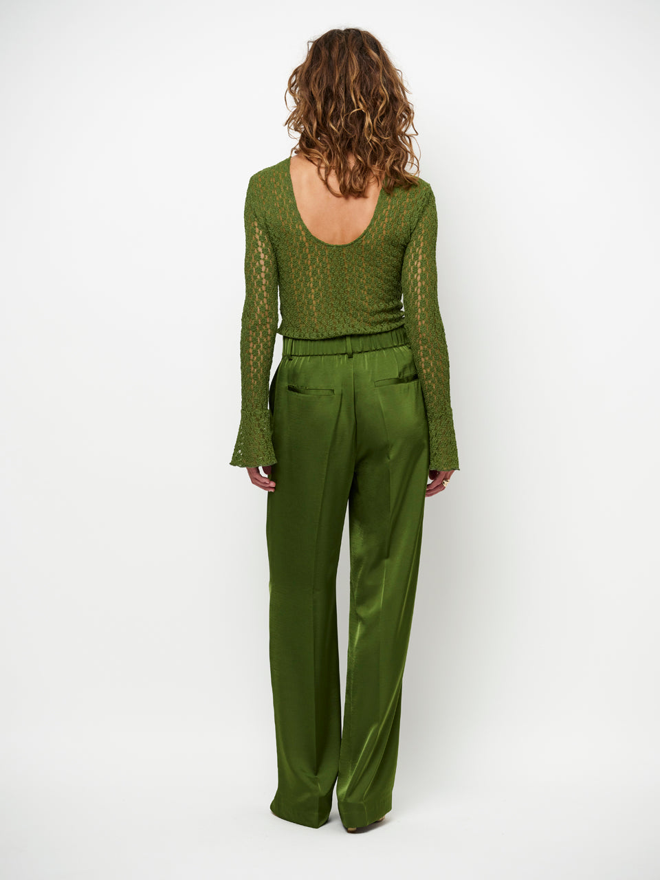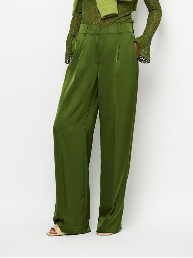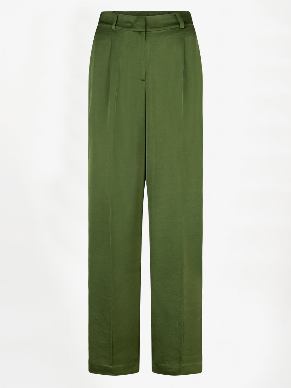 De Jules broek in Basil Green combineert een verfijnd silhouet met modern comfort. Gemaakt van 100% gerecycled polyester satijn met mechanical stretch. De stof heeft een subtiel kreukeffect dat zorgt voor extra textuur en diepte. De hoge taille, frontplooien en wide leg pasvorm creëren een flatterend geheel. De elastische tailleband achter zorgt voor draagcomfort, de hele dag door.