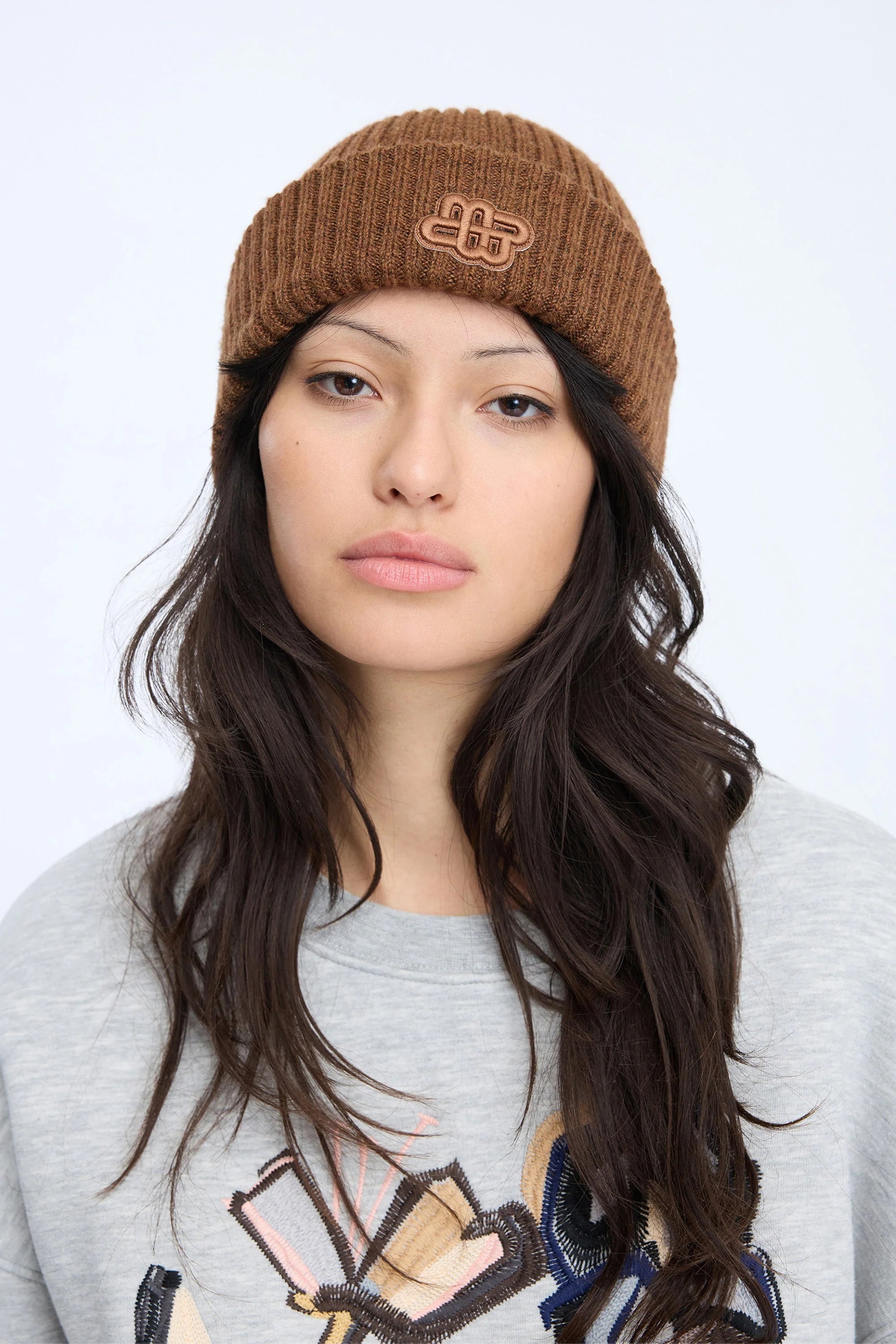 Likaner Beanie van Munthe in de kleur 'Brown'. Een mooie geribde gebreide muts met een elegant MUNTHE-embleem aan de voorkant. Gemaakt van een zachte gerecyclede polyesterblend. Perfect voor de koude dagen! Beschikbaar in meerdere kleuren.