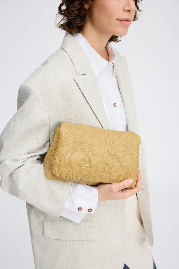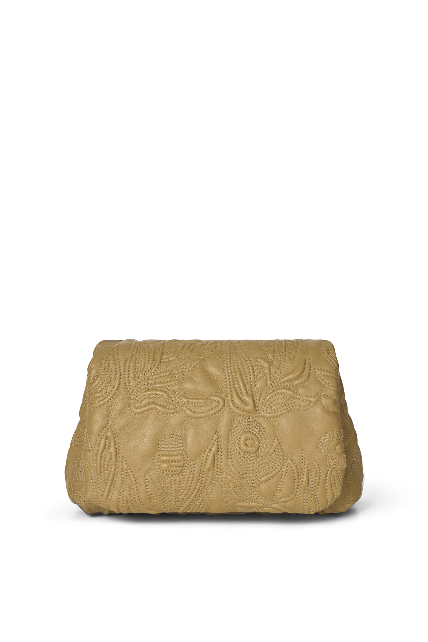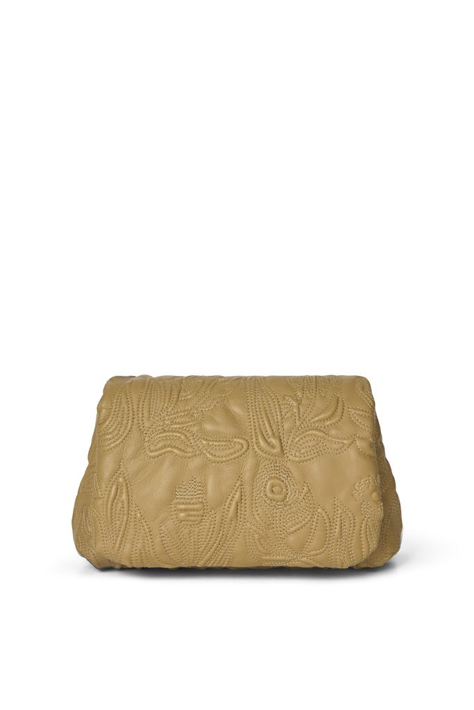 Roluke Bag in de mooie kleur Gold van het merk Munthe. Een prachtige 100% leren tas met een elegant reliëf bloemenpatroon. De tas is voorzien van een afneembare schouderband. Binnenin heeft de tas twee grotere compartimenten en een kleiner zijvakje, en hij sluit met twee magneetknopen.