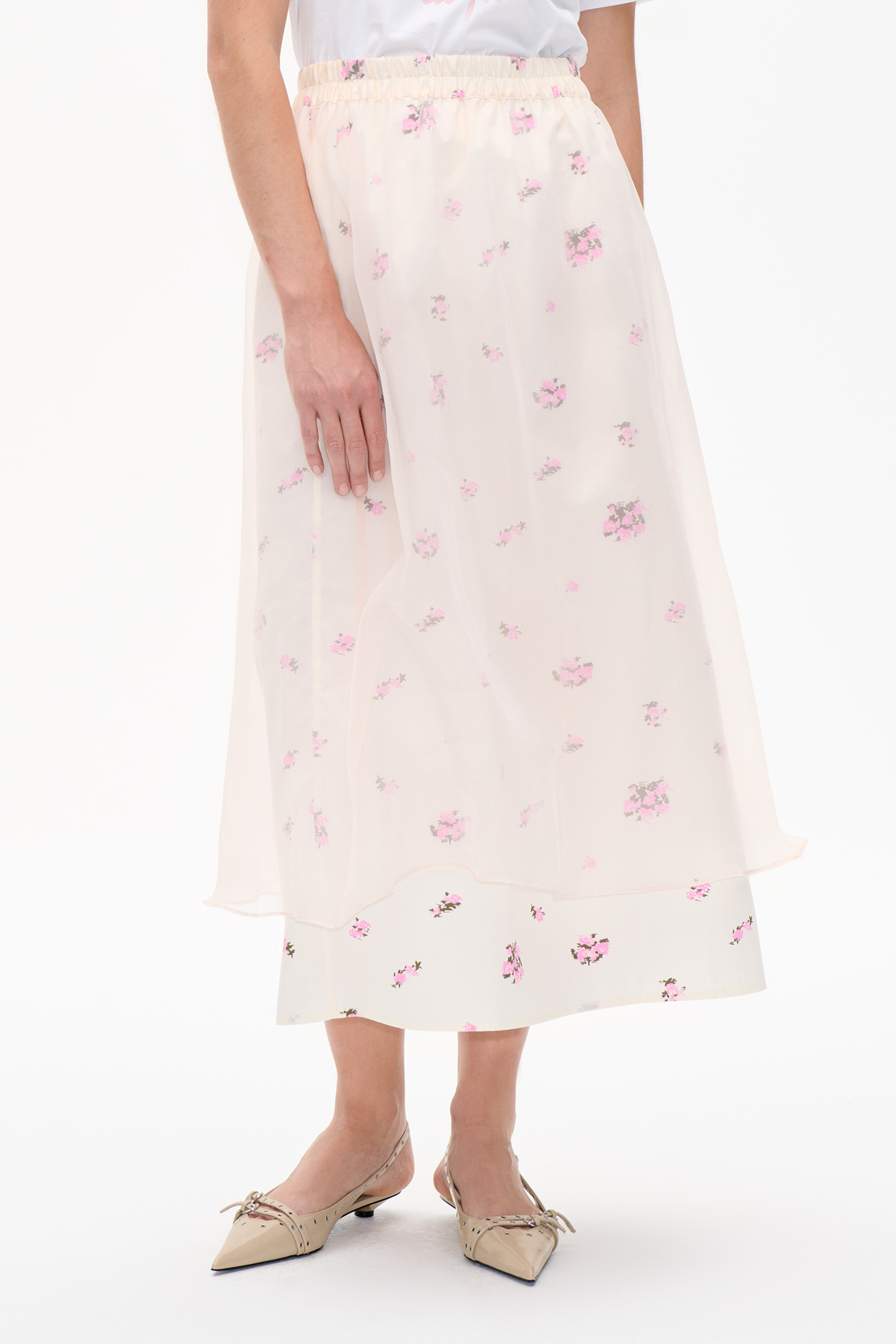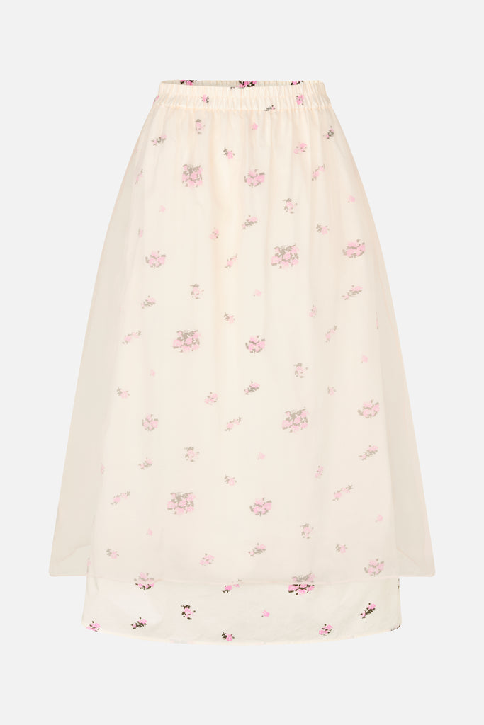 Sevari Skirt in de kleur 'Fuchsia Pink' van het Deense merk Baum und Pferdgarten. Mooie rok met een bloemen dessin en een laag tule eroverheen. De rok heeft een elastieke band en sluit daarom mooi aan.