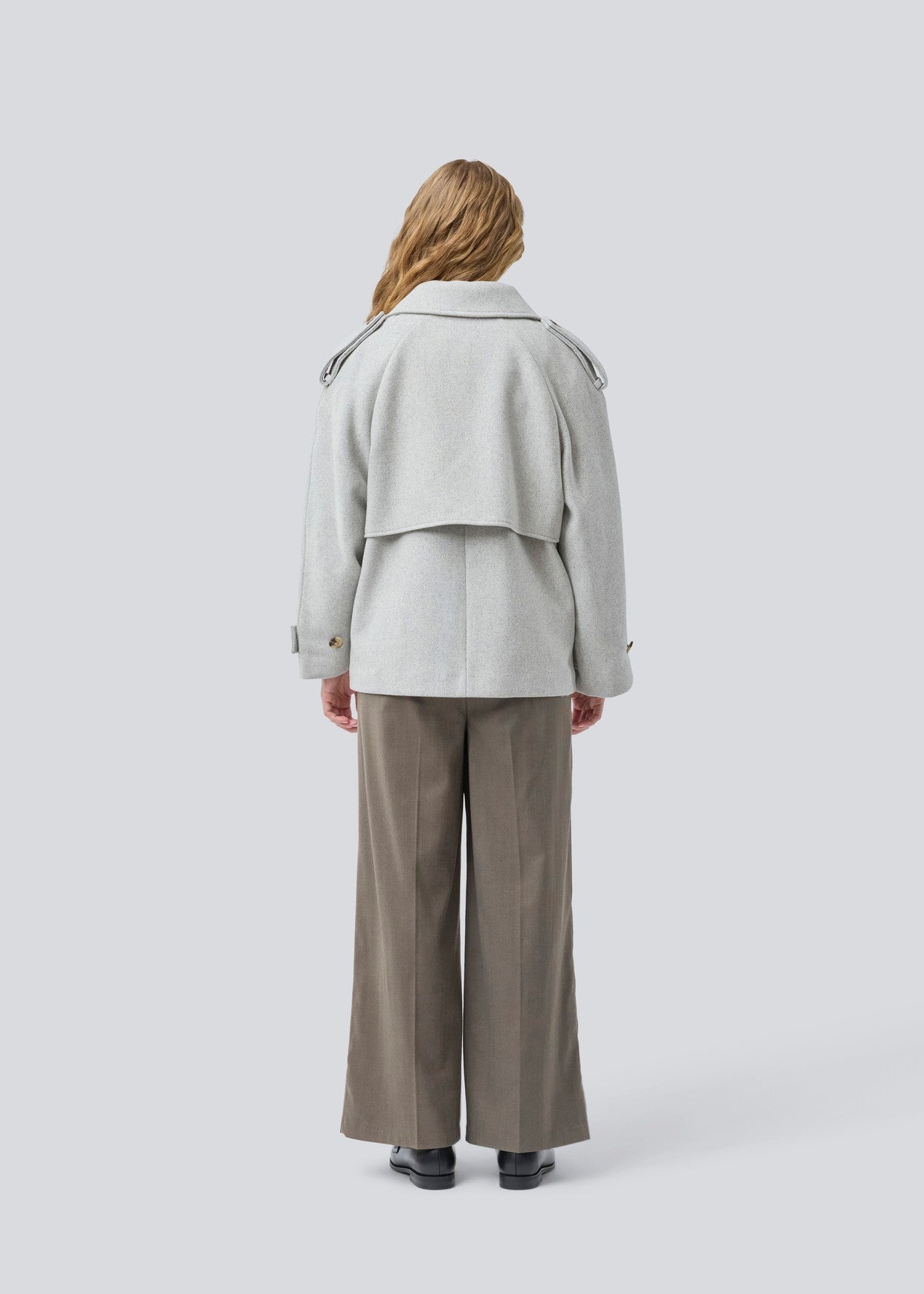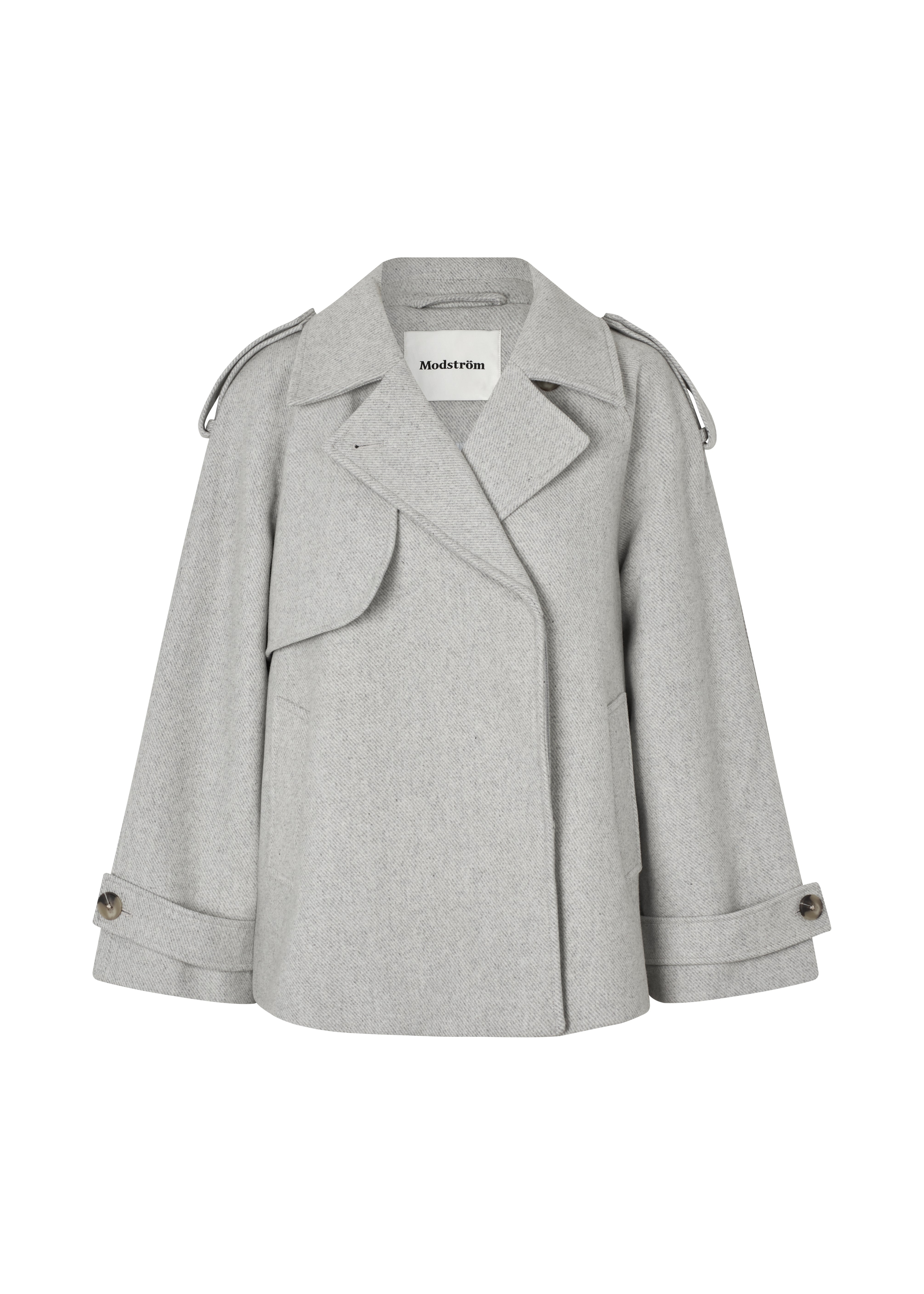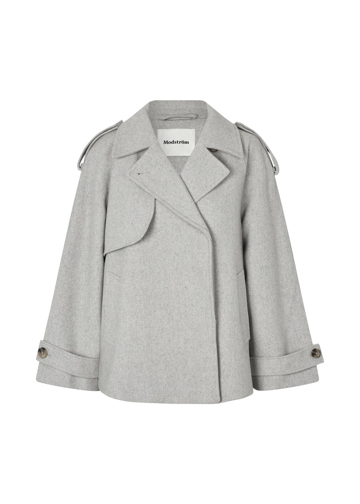 EsmundMD Jacket in de kleur 'Grey Melange' van het Deense merk Modström. Een mooie cropped double-breasted wollen jas met verborgen knopen. De jas heeft klassieke jasdetails met raglanmouwen en een hoge schouderpas aan de achterkant. De jas is gevoerd.
