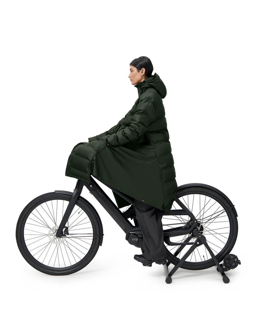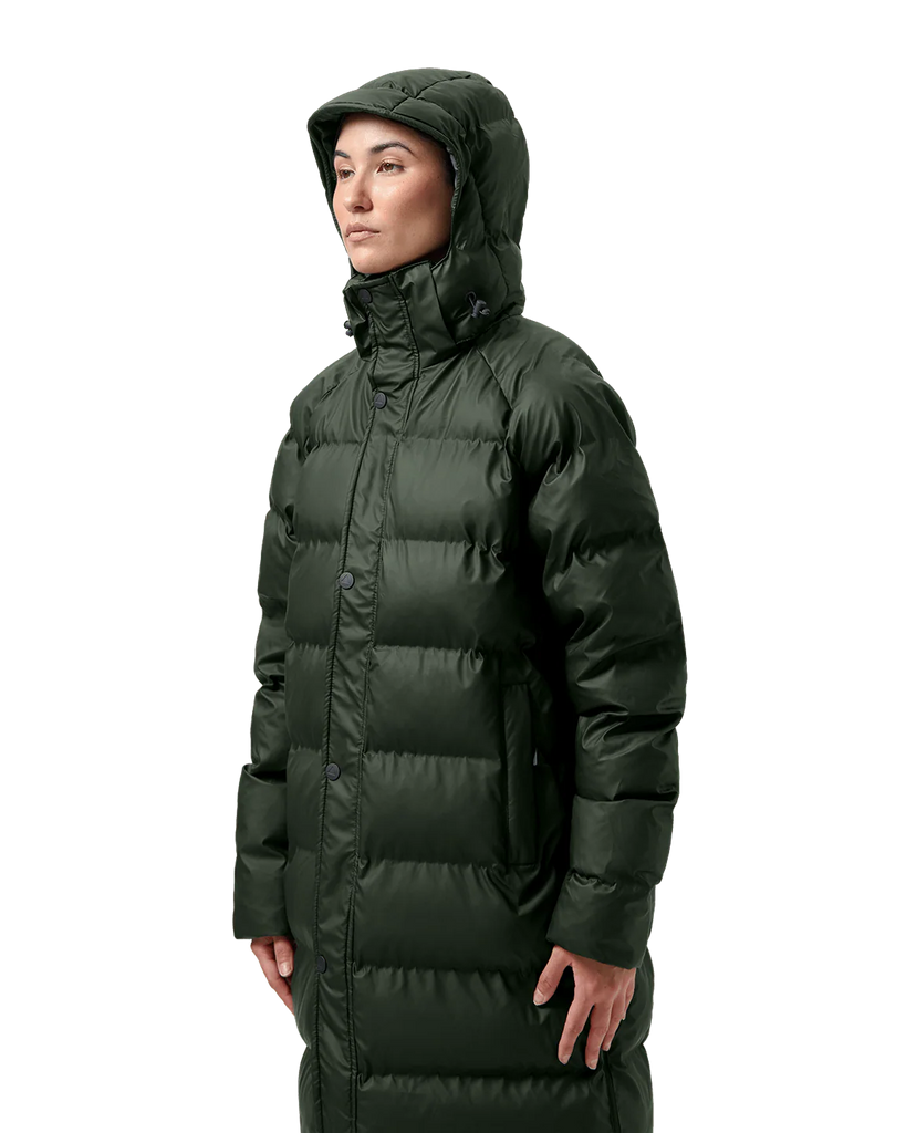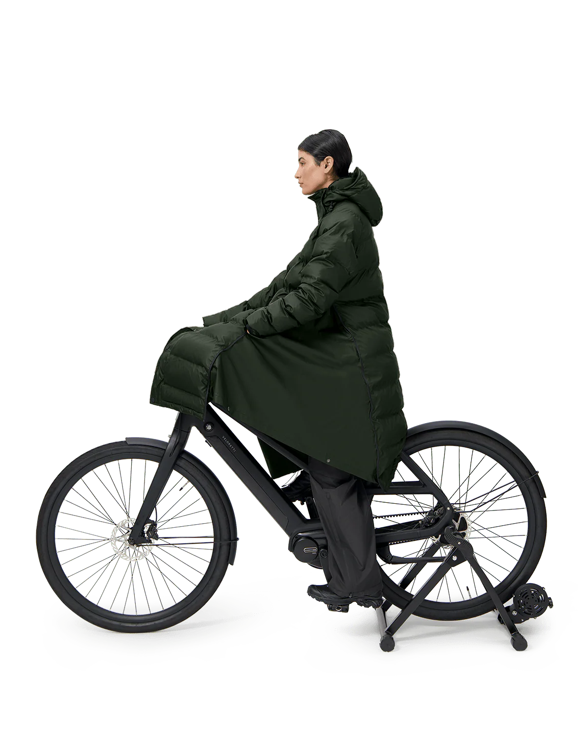 De oversized Puffer in de kleur 'Dark Oak' voor dames is een volledig waterdichte winterjas. Verandert eenvoudig in een poncho voor op de fiets of scooter. Ja, deze jas is vegan – zowel de stof als de vulling zijn gemaakt van 99 gerecyclede plastic flessen.