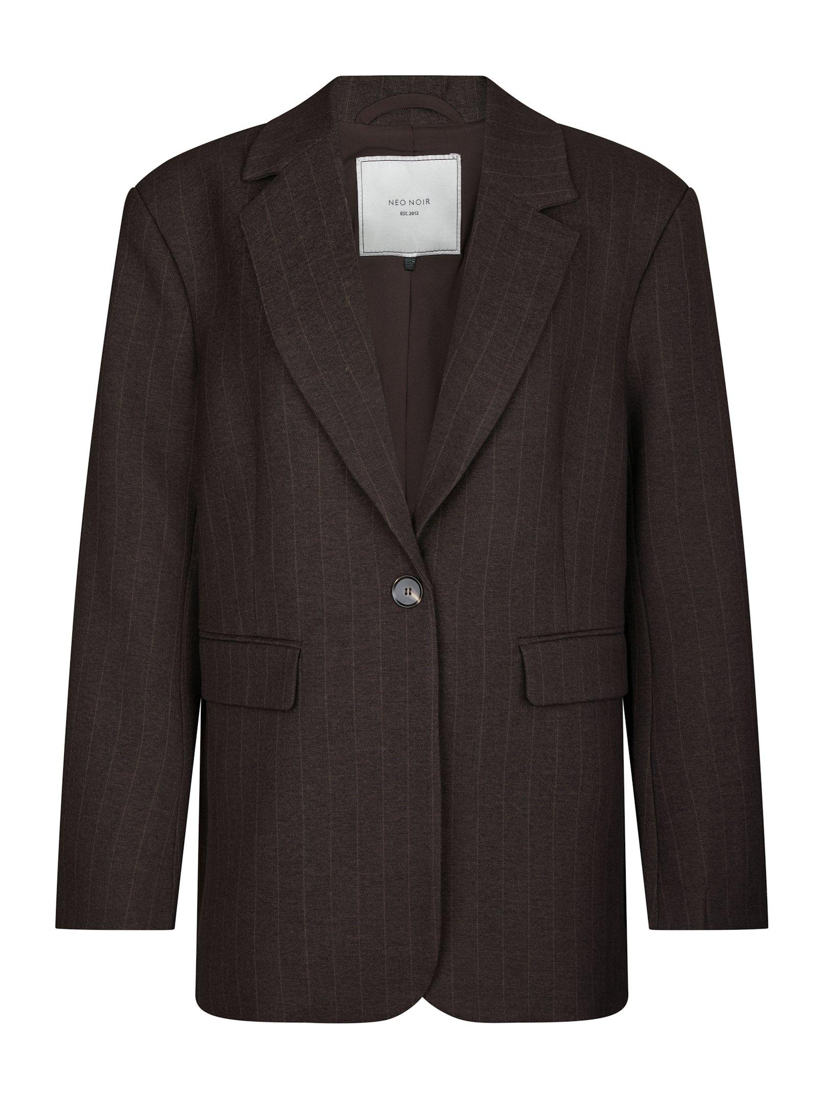 Gaby Pinstripe Blazer in de kleur Dark Brown van het merk Neo Noir. Coole oversized blazer met schoudervullingen en een enkele knoopsluiting aan de voorkant. De blazer is gemaakt van een mooie, fijne krijtstreepstof. Het model is 176 cm lang en draagt maat 36.