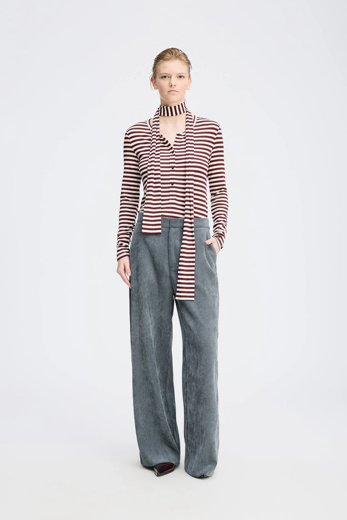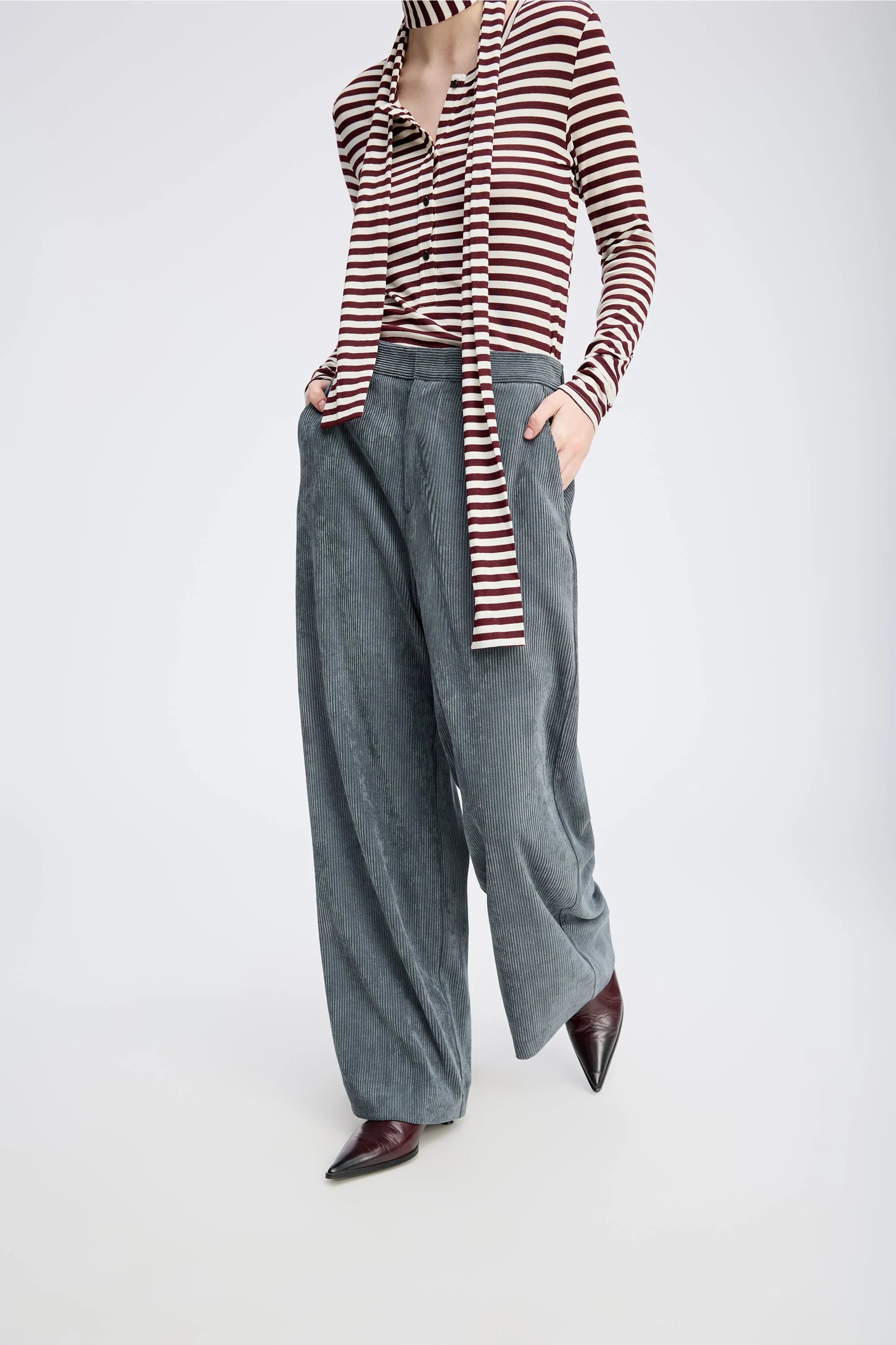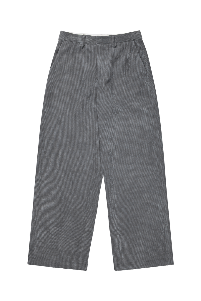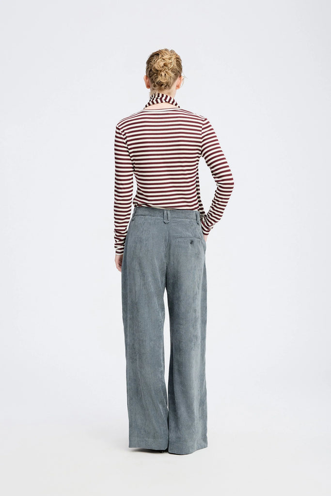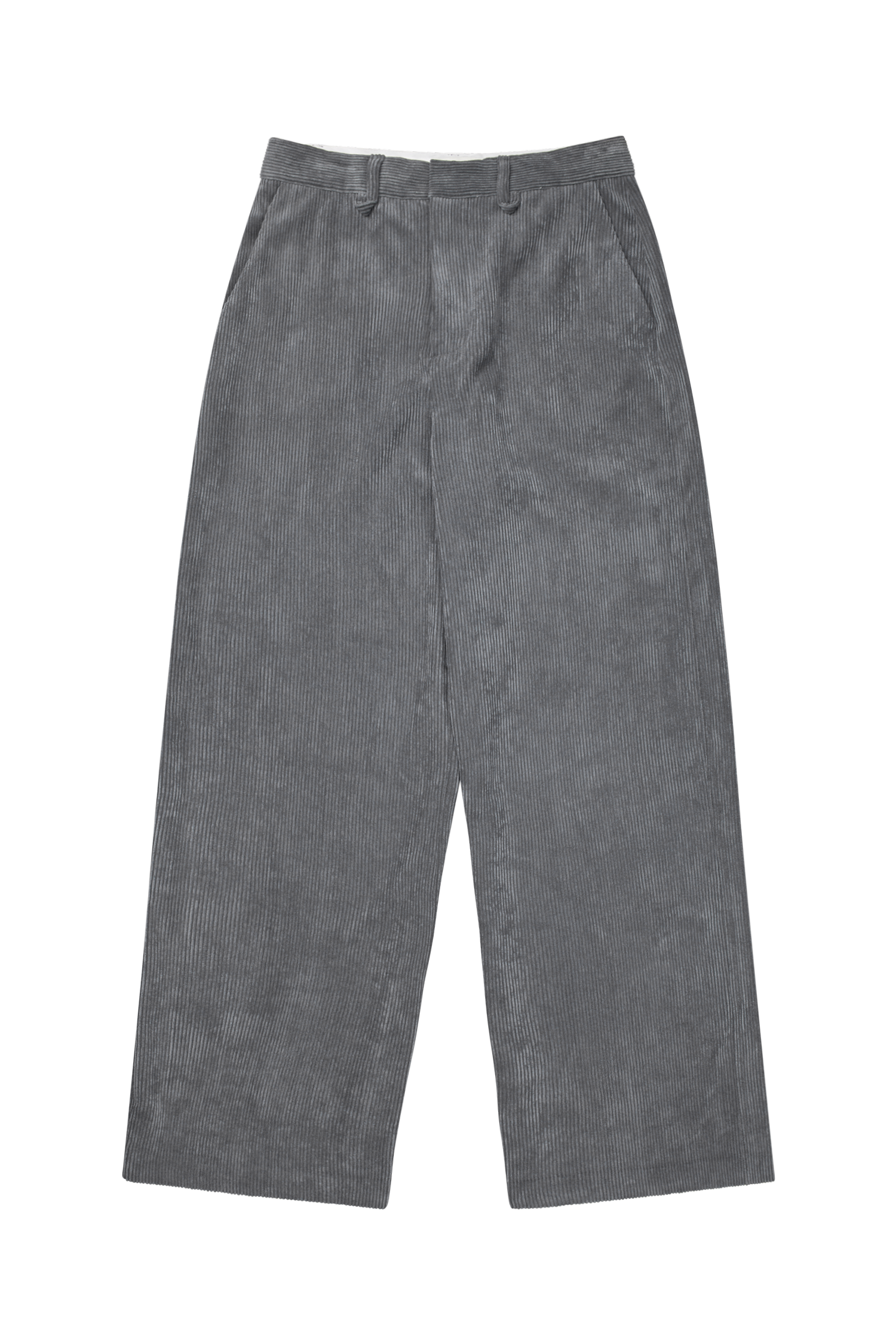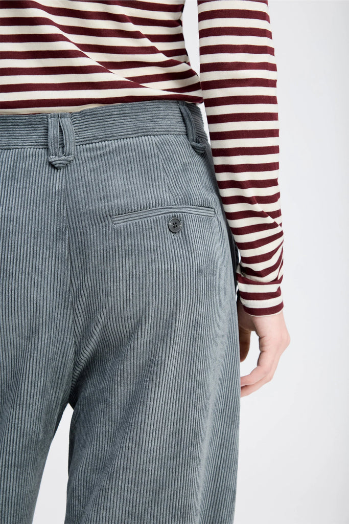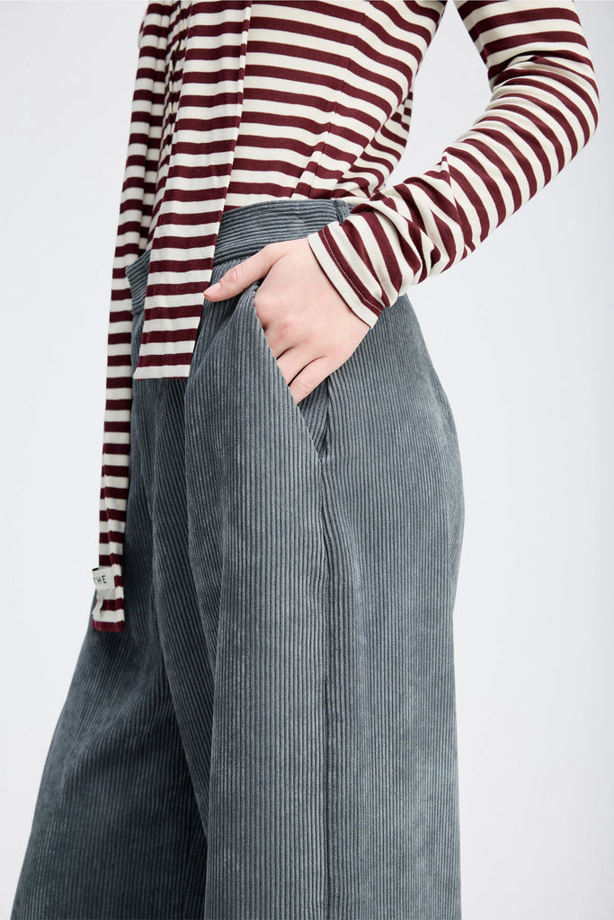 Lelouis Pants in de kleur 'Charcoal' van het Deense merk Munthe. Mooie corduroy broek, ontworpen met elegante details zoals wijde pijpen, riemlussen en zijzakken. De broek sluit aan de voorkant met een rits