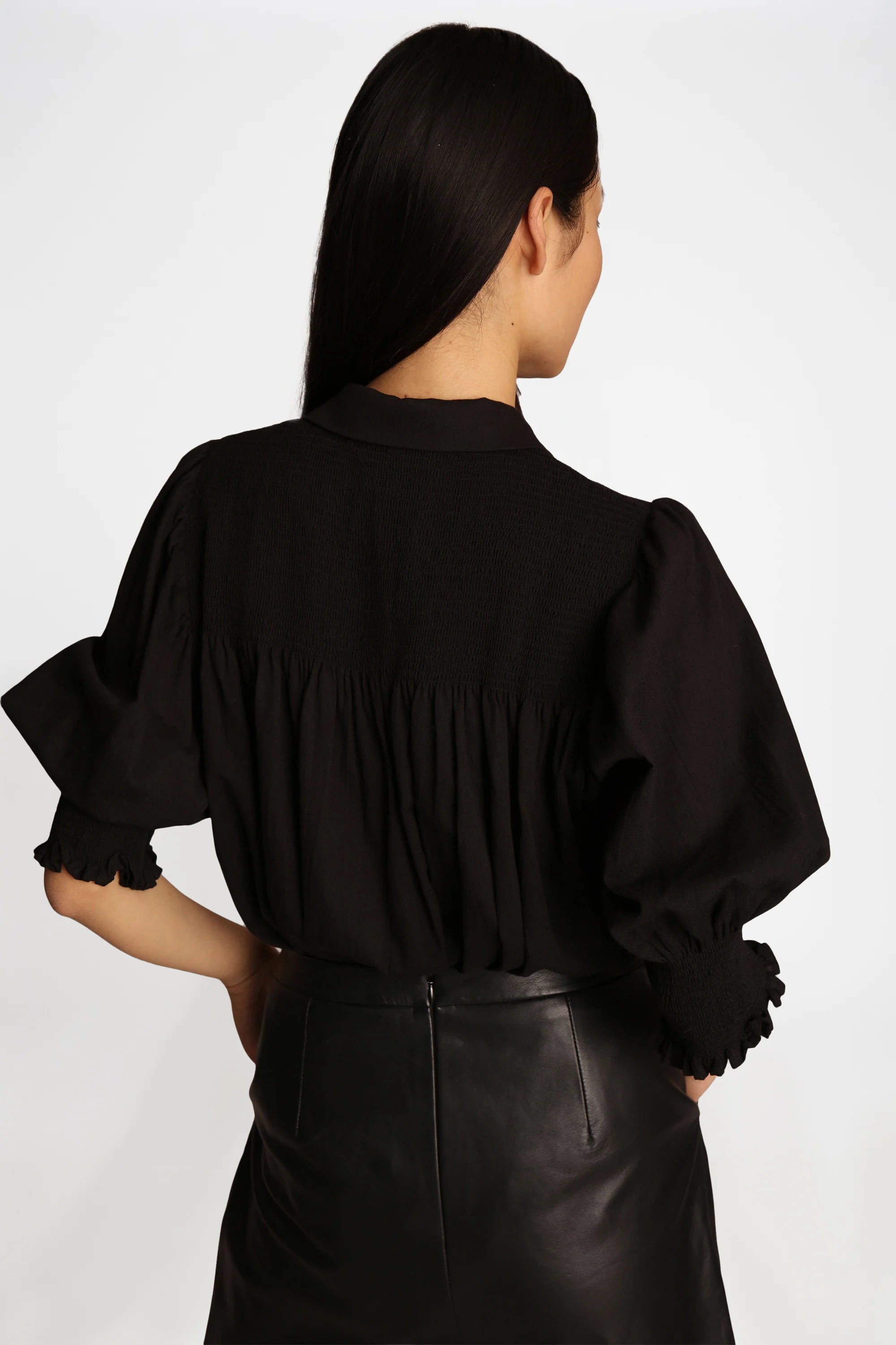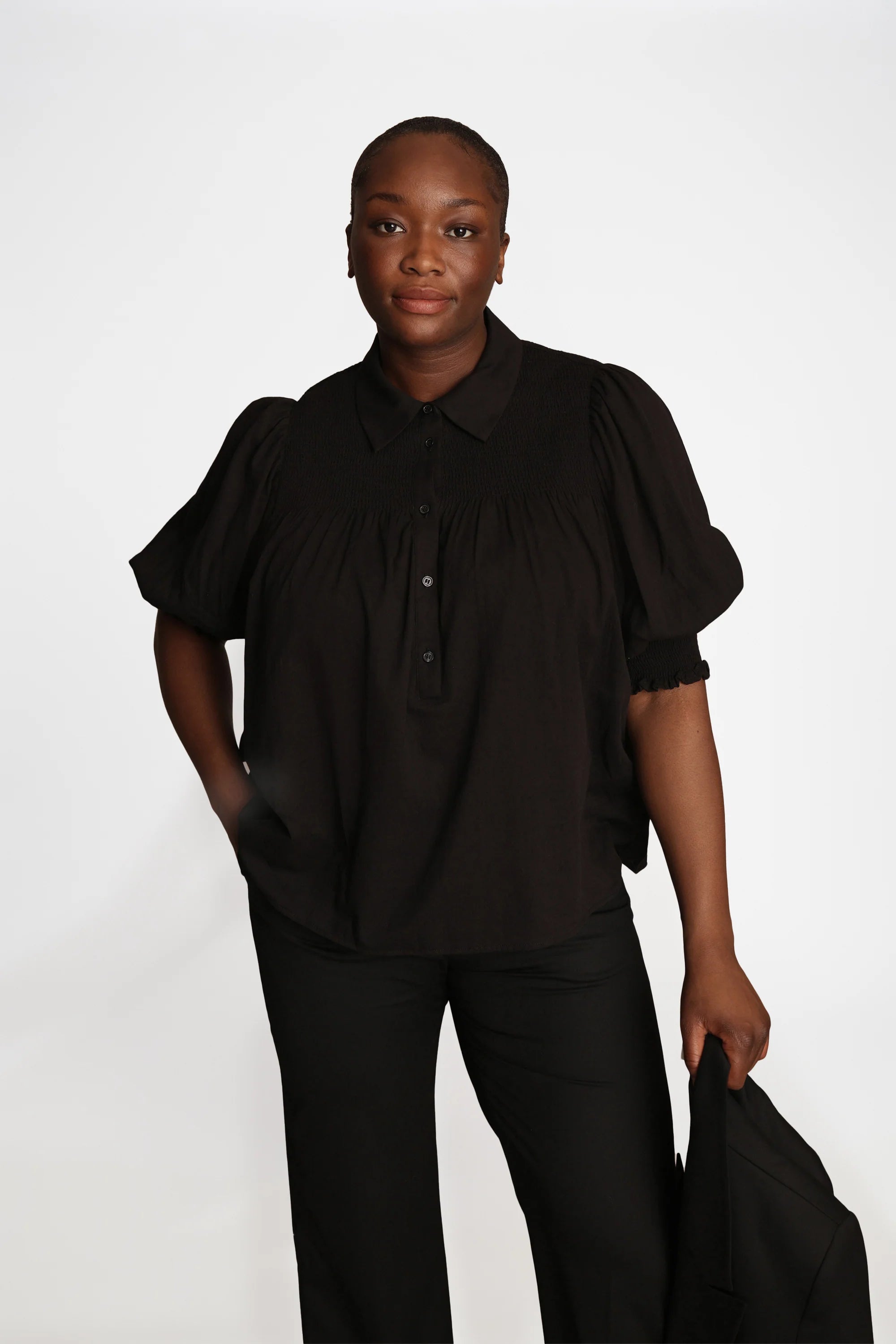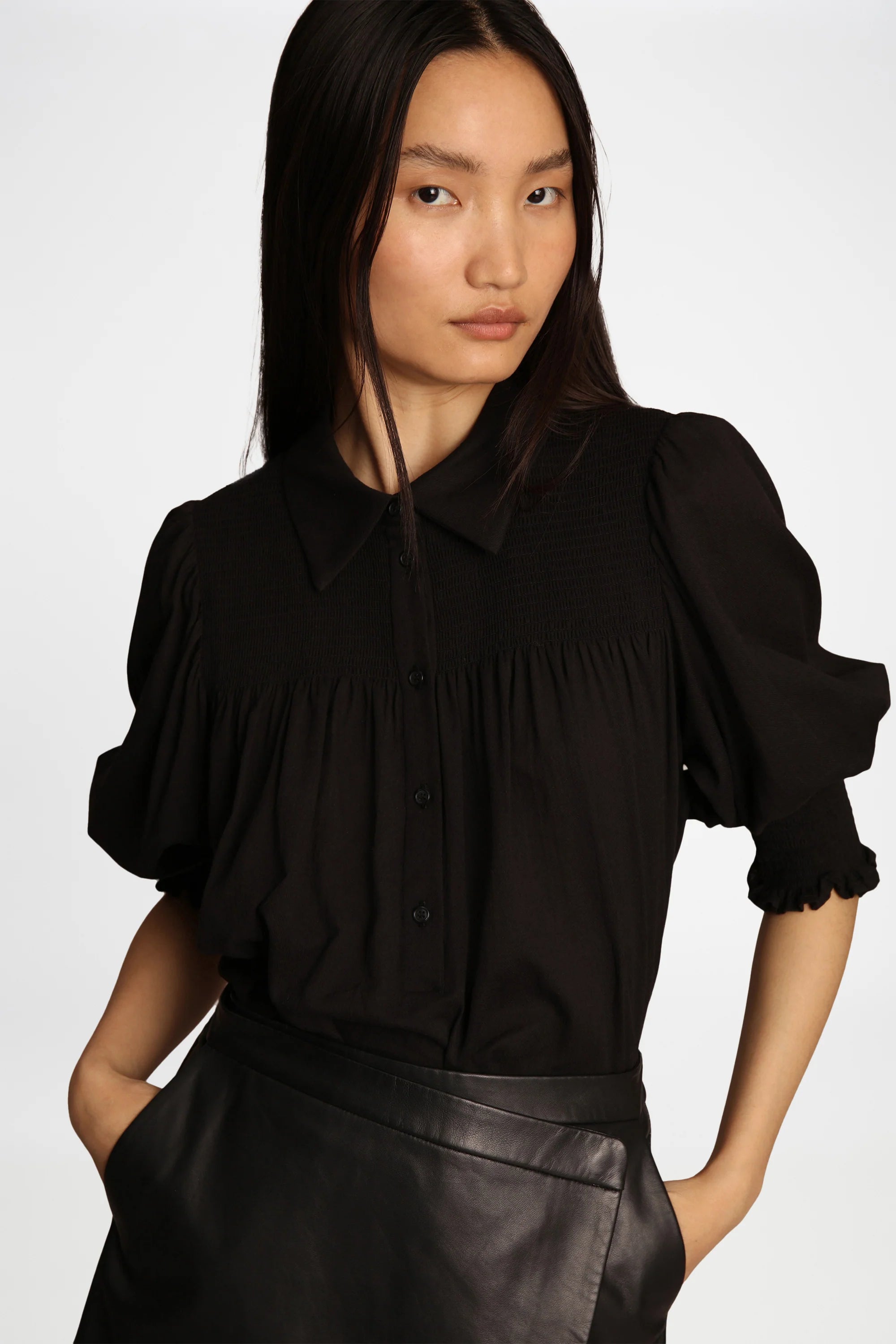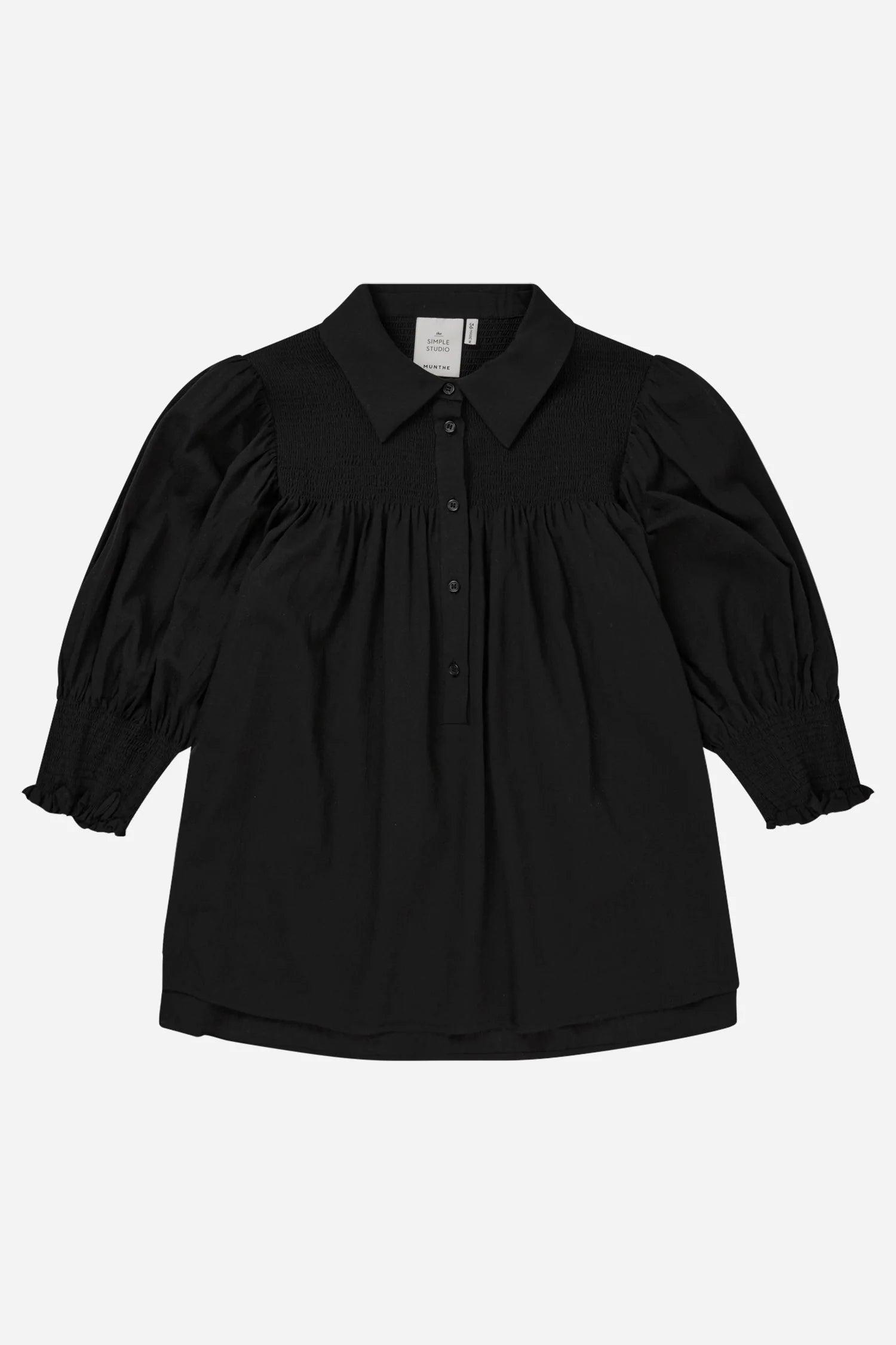 Chapter blouse van Munthe in de kleur 'Black'. Vrouwelijke blouse met prachtige smokdetails op de mouwen, borst en achterkant. De blouse heeft een kleine kraag en een elegante knoopsluiting aan de voorkant. Blouse komt uit de Simple Studio collectie en is daarom de perfecte basis. Gemaakt van 100% Katoen.