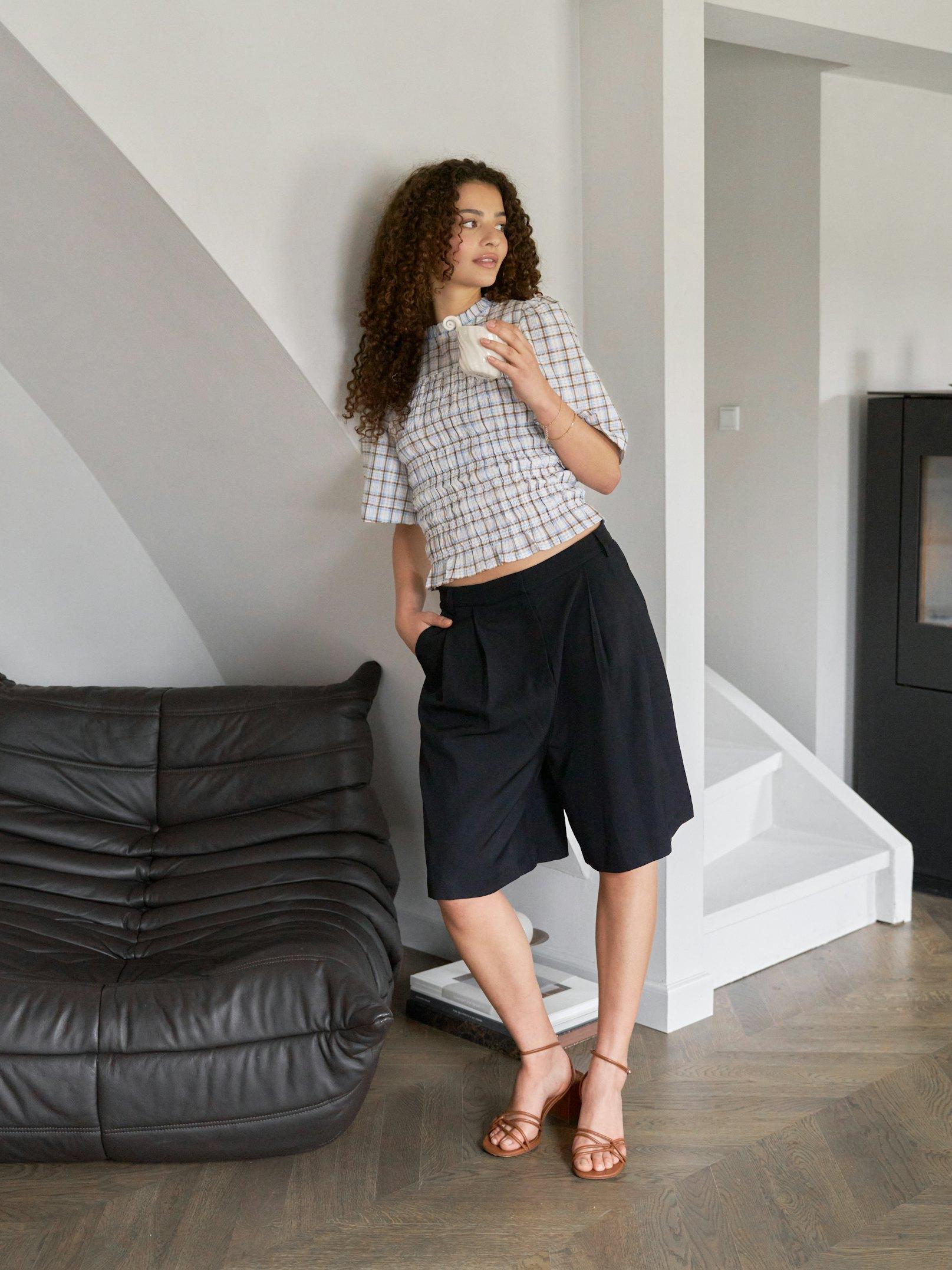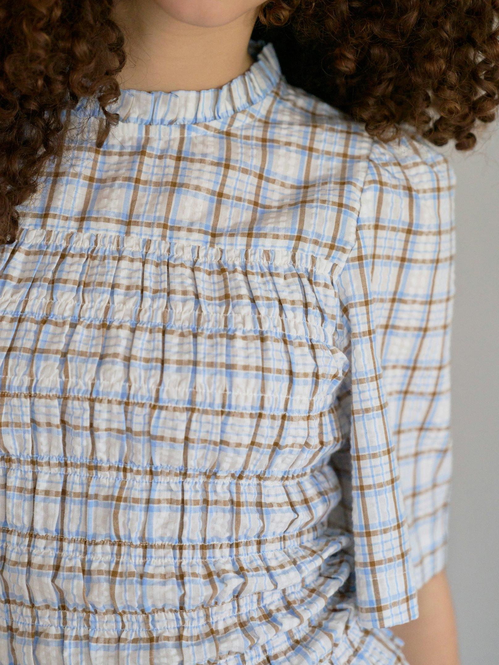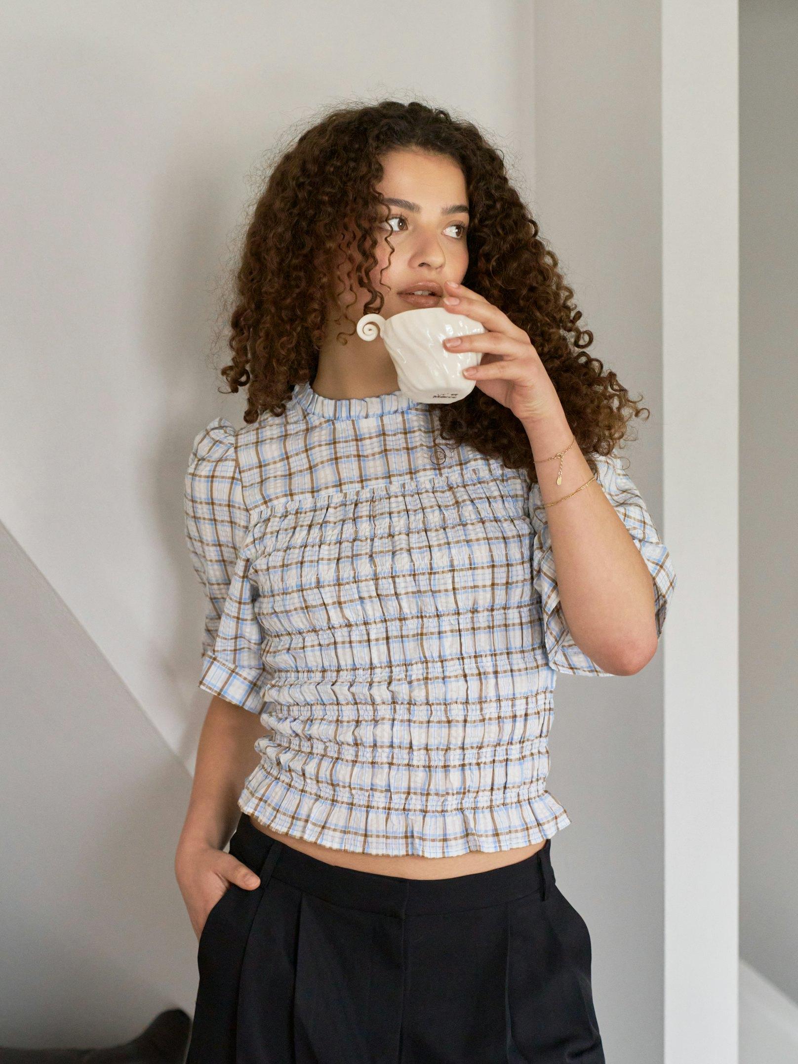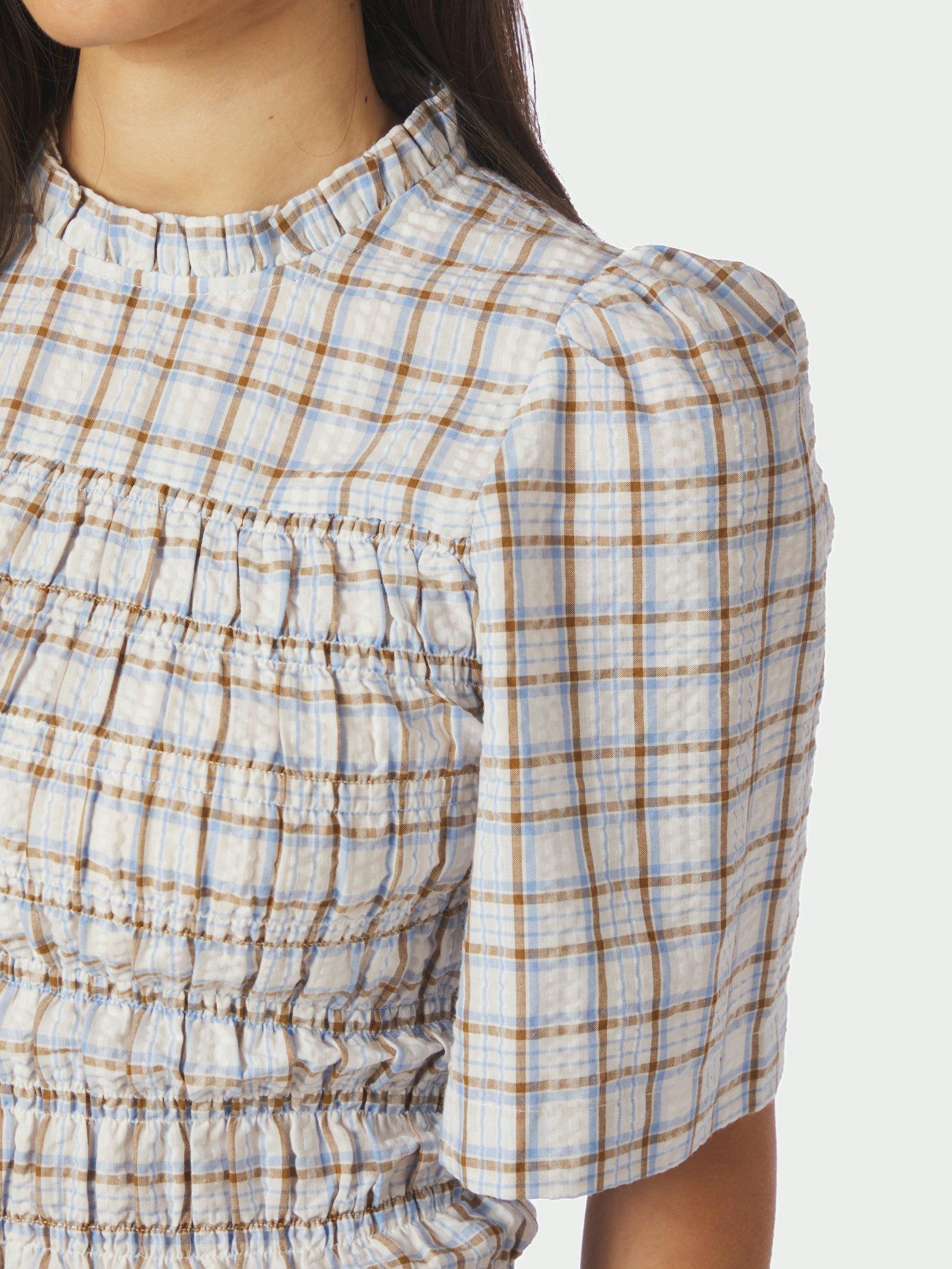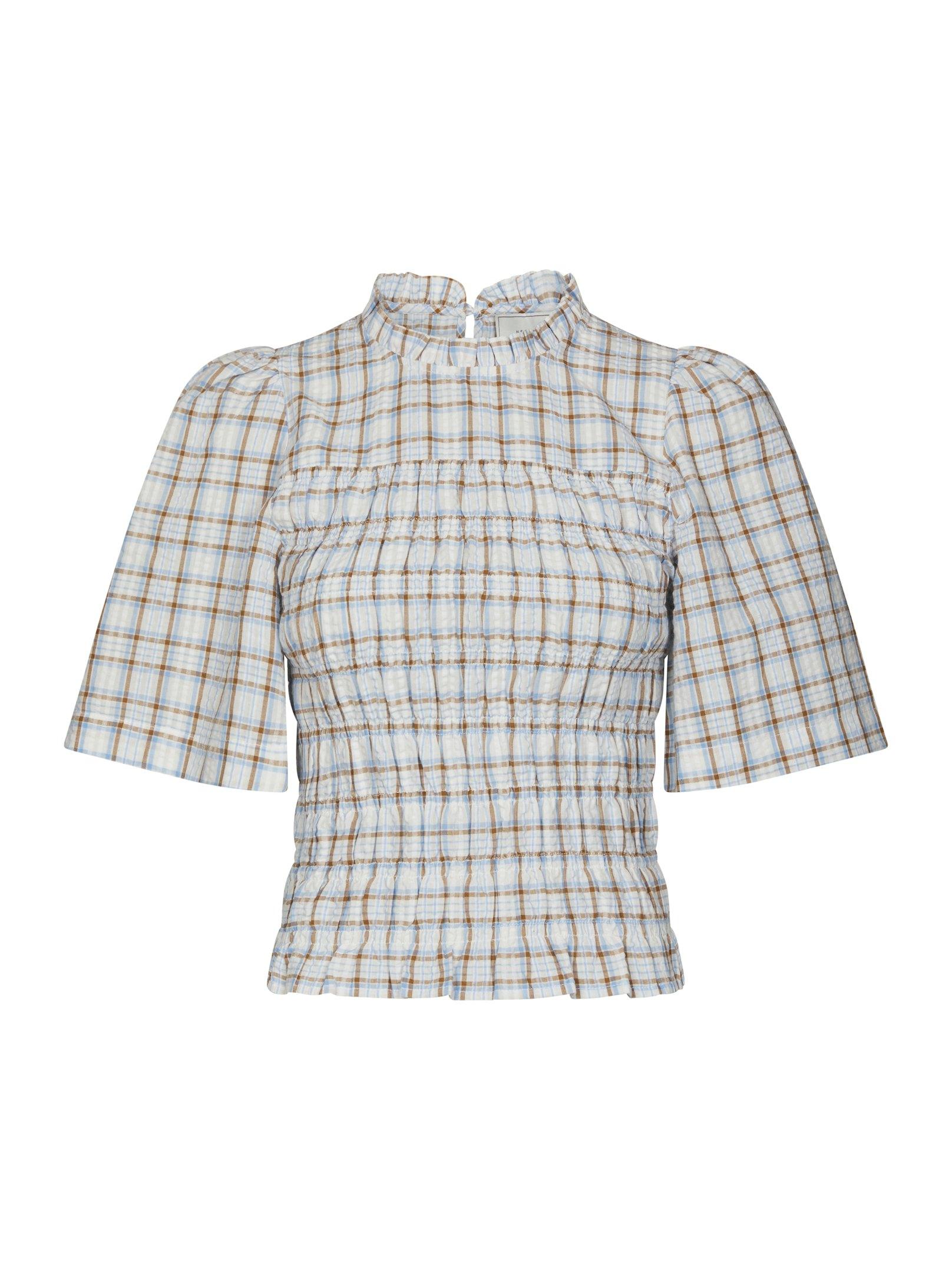 Possini Mega Check Blouse in de kleur 'Light Blue' van het Deense merk Neo Noir. Een vrouwelijke, aansluitende top met smockwerk en mouwen. De top heeft smockwerk op het lijfje en wijde mouwen. De print is een leuke ruit. Het model is 176 cm lang en draagt maat 36.