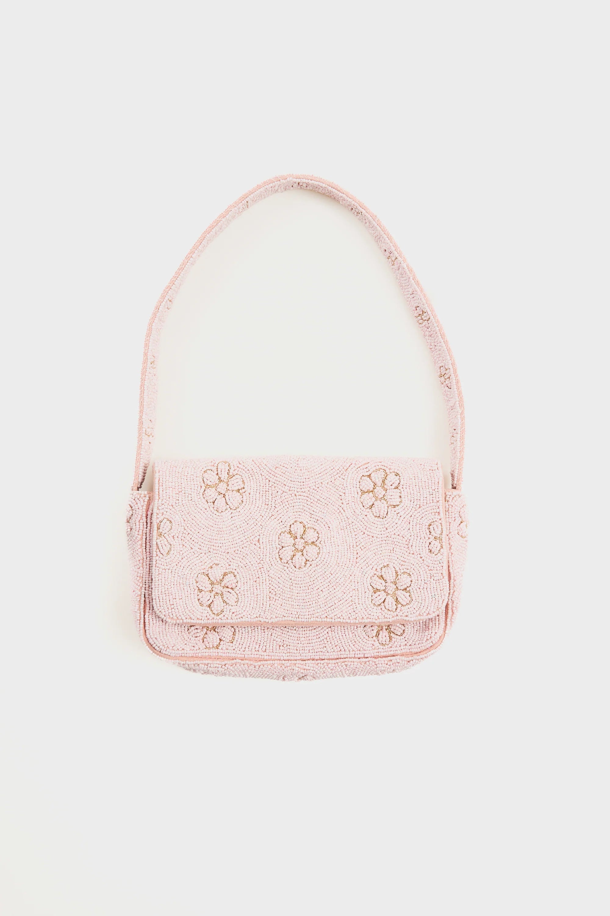 Een baguette tas van geborduurde kralen van het Franse merk Antik Batik, volledig handgemaakt, in een stralende baby pink kleur. Het oppervlak is voorzien van een reliëfachtig bloemenmotief, gevormd door een zorgvuldige samenstelling van kralen die een dichte en verfijnde textuur creëert. Een delicaat accessoire waarin de precisie van ambachtelijk vakmanschap samensmelt met een eigentijds design.