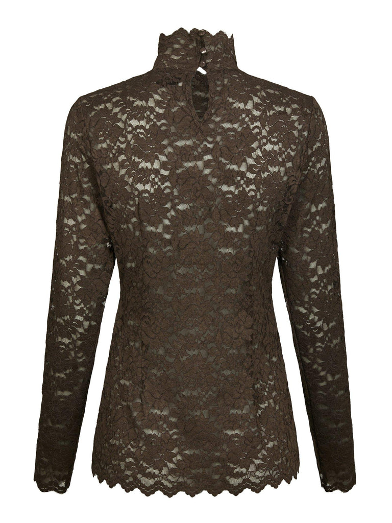 Liza Laceflower Blouse in de kleur Chocolate Brown van het Deense merk Neo Noir. Mooie top van stretchkant met col en knoopjes in de nek. De top hoor aansluitend te zijn, maar is erg comfortabel, dankzij de prachtige stretchkant. Draag hem los of combineer heel gaaf met een sweater of blazer.