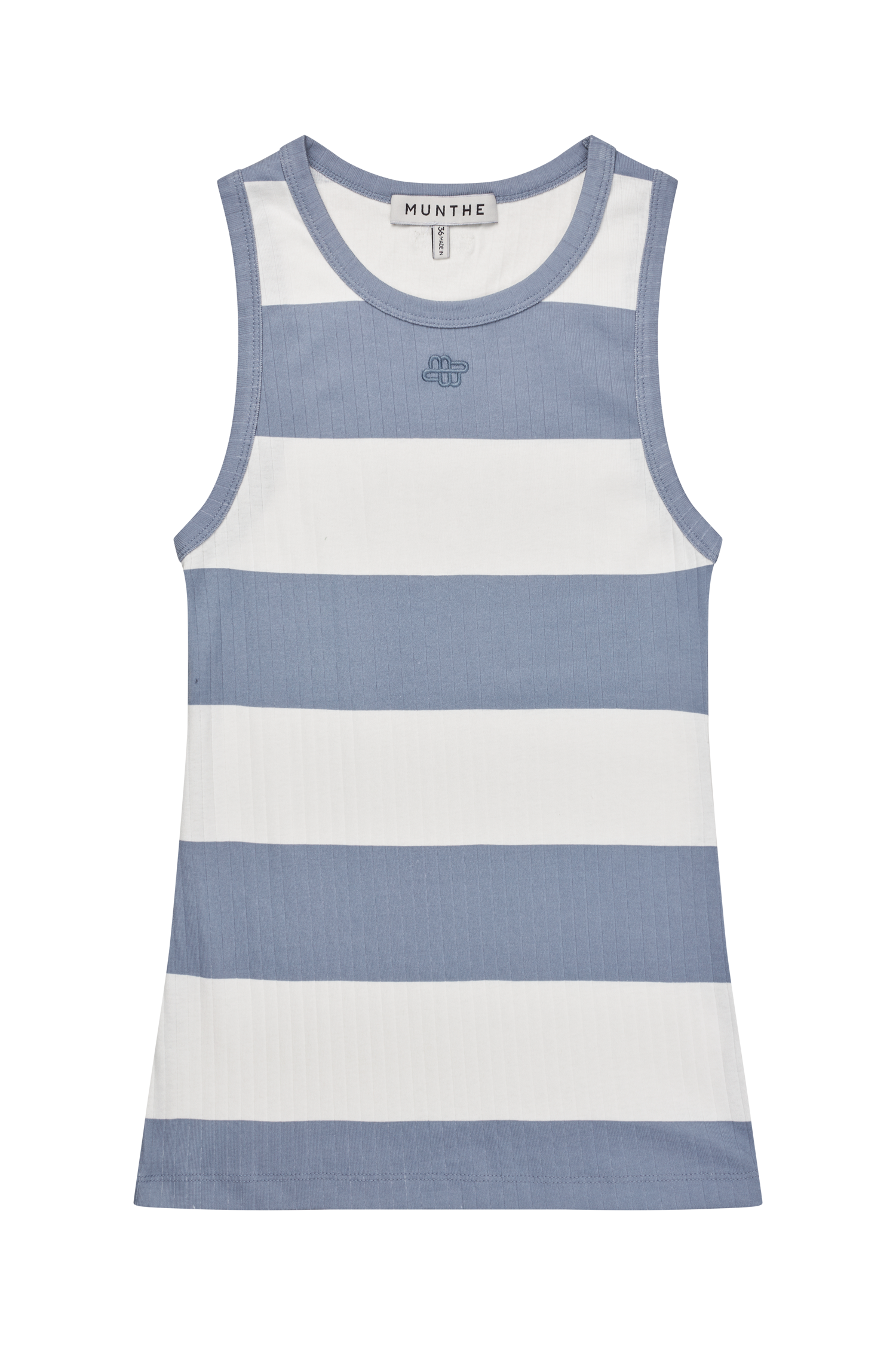 Tezza Top in Stripe Blue van het Deense merk Munthe. Gestreepte tanktop van 100% biologische katoen met een elegant MUNTHE embleemborduursel op de borst. Deze tanktop heeft een nauwsluitende pasvorm en een ronde halslijn.