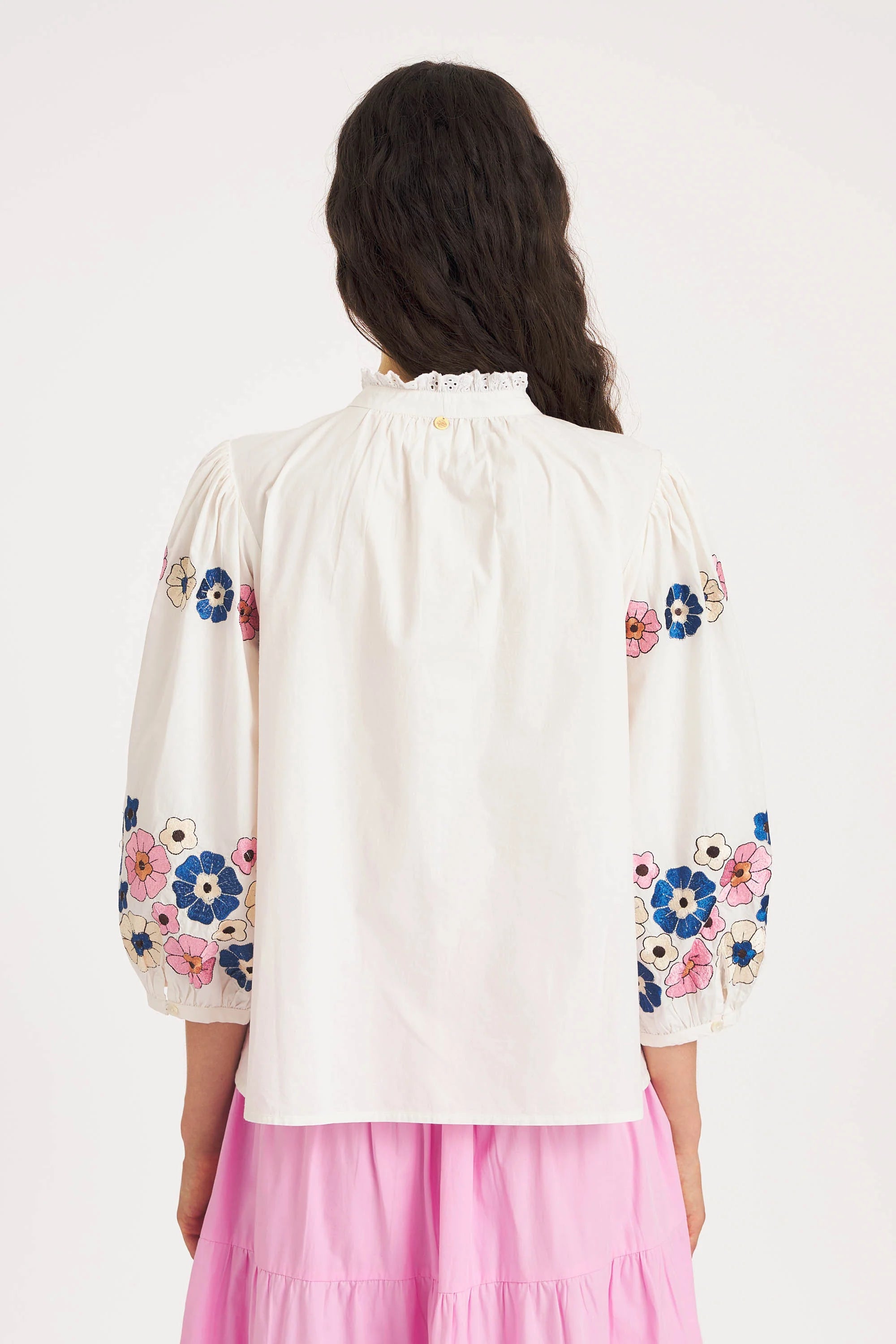 Amantina Blouse in de kleur 'Cream' van het Franse merk Antik Batik. Zachte katoenen poplin blouse versierd met zijdezachte bloemenborduursels in Mexicaanse stijl, die de borst en mouwen sieren. De sluiting en kraag zijn afgewerkt met kant, terwijl de mouwen wijdvallend zijn. Draag haar op een jeans en je bent gelijk af!