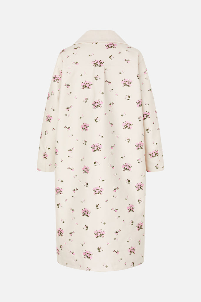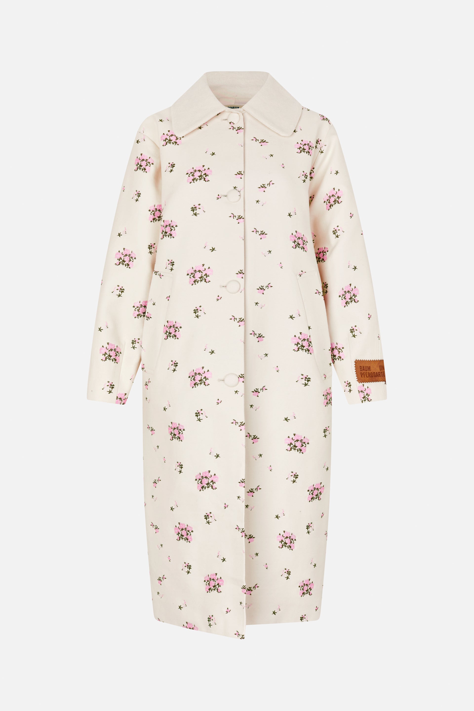 Daisy Coat in de kleur 'Fuchsia Pink Flower' van het Deense merk Baum und Pferdgarten. Een geweldige oversized lange jas met knoopsluiting, steekzakken en kraag.