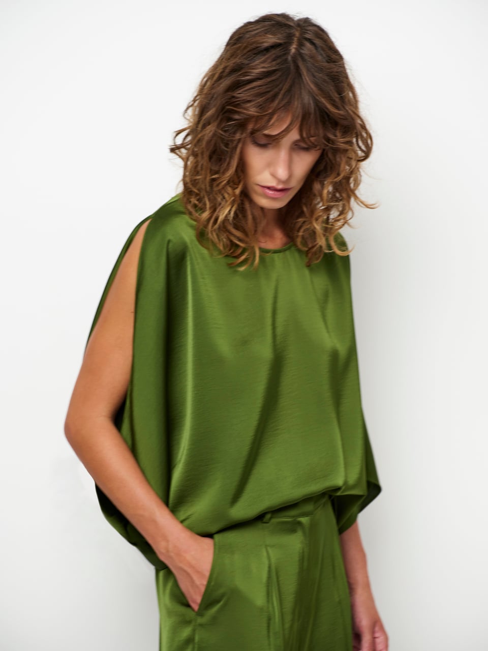 Risette Flowing Satin Top - Basil Green