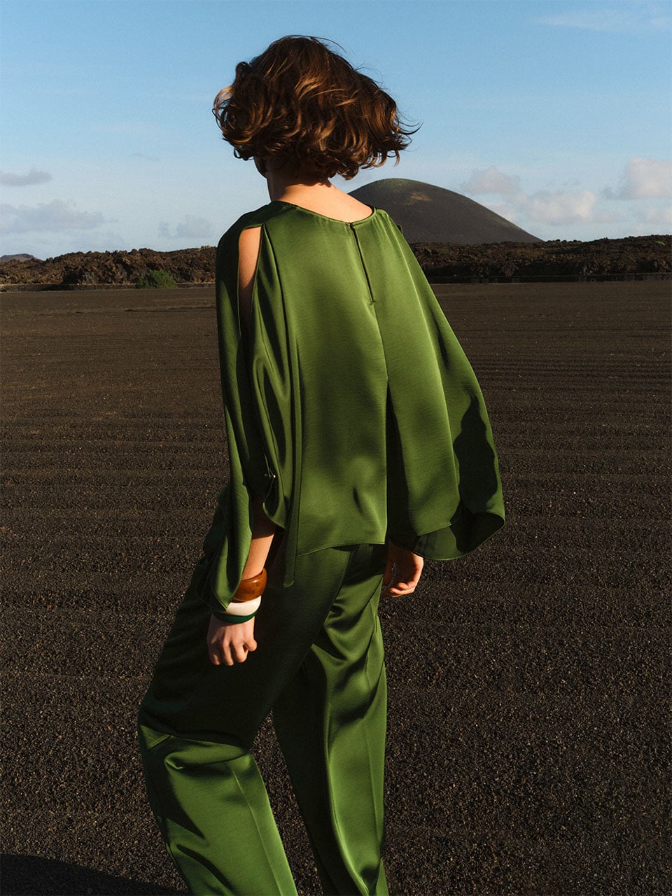 De Risette top in Basil Green van Dante6 straalt zachte elegantie uit dankzij de vloeiende stof en subtiele glans. De boothals omlijst de schouders op stijlvolle wijze, terwijl de wijde mouwen zijn afgewerkt met een split, gesloten met een goudkleurige knoop — een verfijnd detail dat beweging toevoegt. De keyhole-sluiting aan de achterkant maakt het ontwerp compleet. Draag op verschillende manieren en combineer met de bijpassende Jules broek voor een vrouwelijke look van dag tot avond.