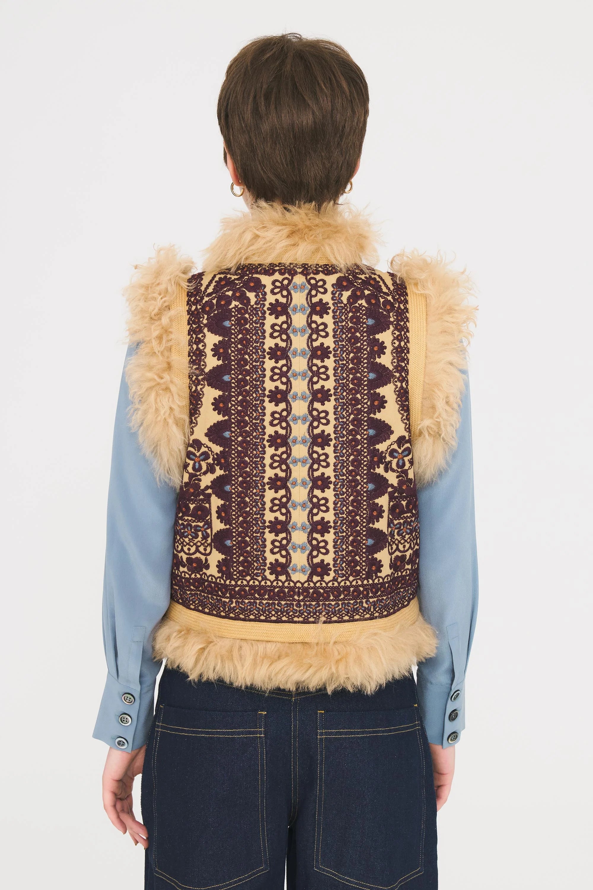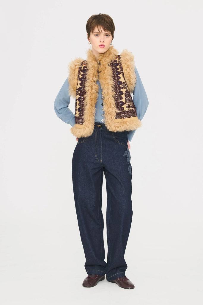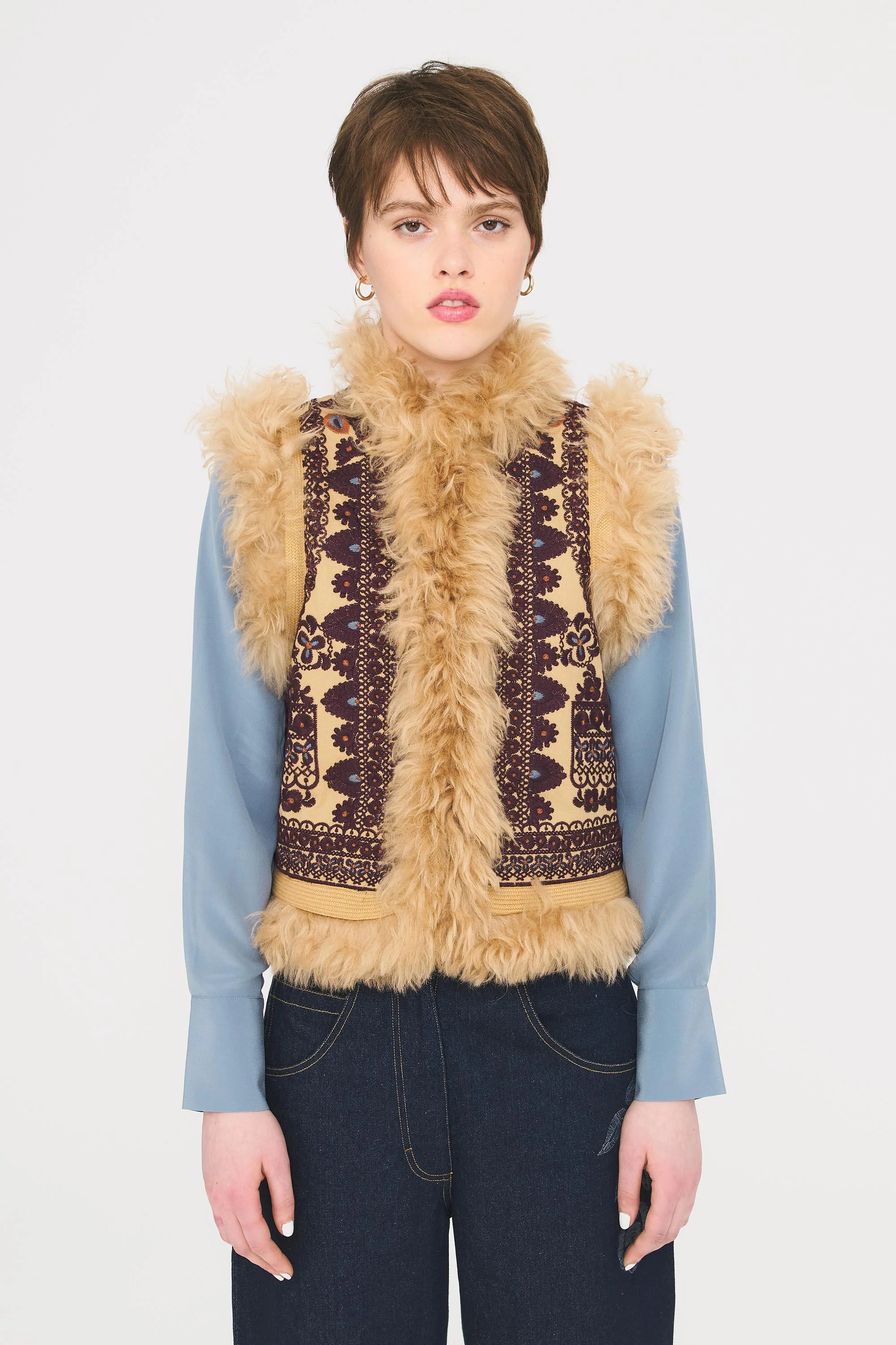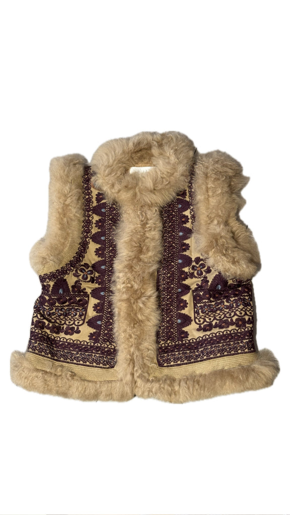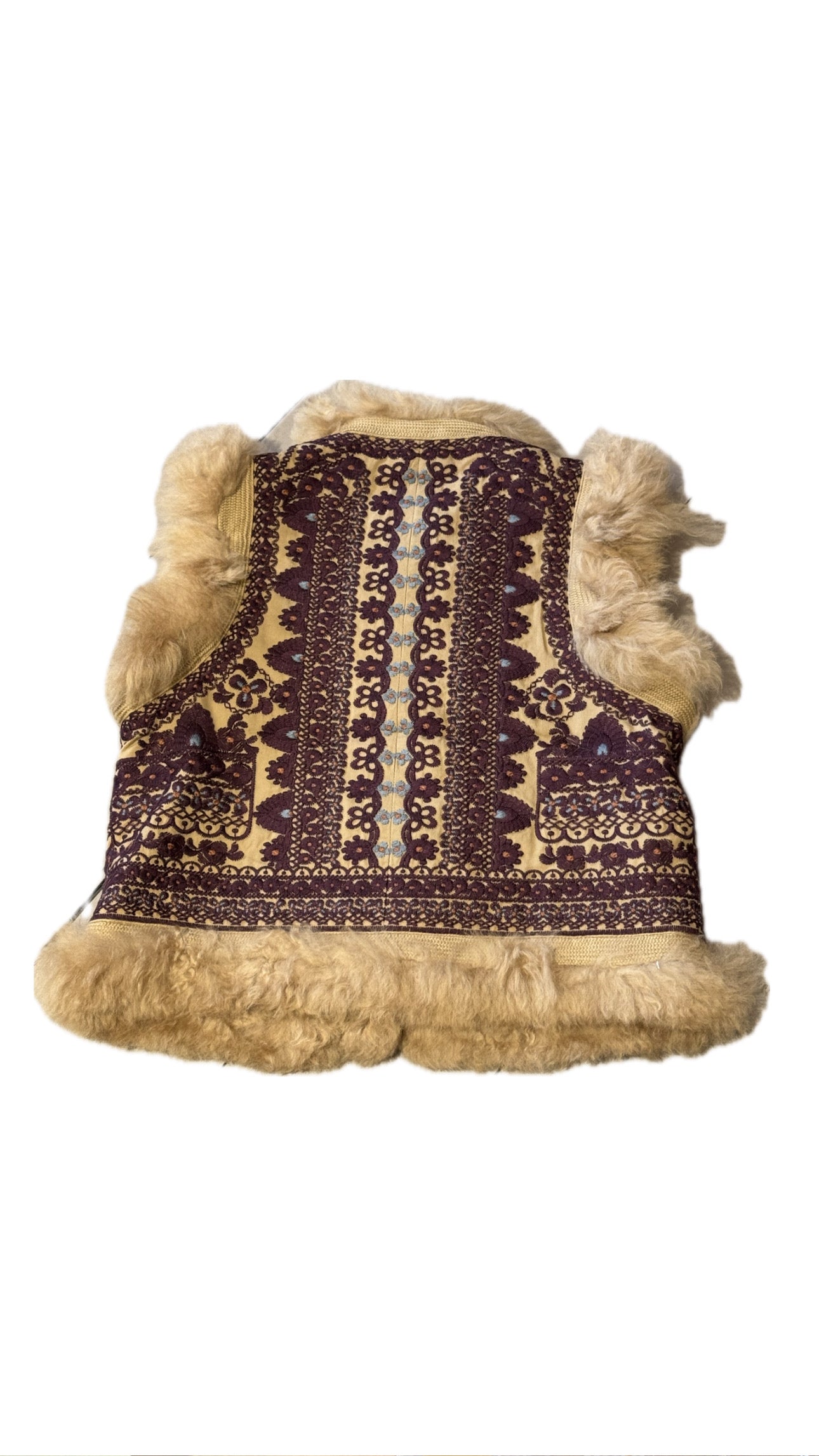 Sandora Gilet in de kleur 'Camel' van het merk Antik Batik. Een prachtige Afghaans geïnspireerd geborduurd gilet. Ambachtelijk bloemenborduurwerk op het hele gilet. Heeft een ultra zachte lamswol binnenkant en afwerkingen van imitatiebont. Het gilet heeft een haak-en-oogsluiting. En kan open of dicht worden gedragen.